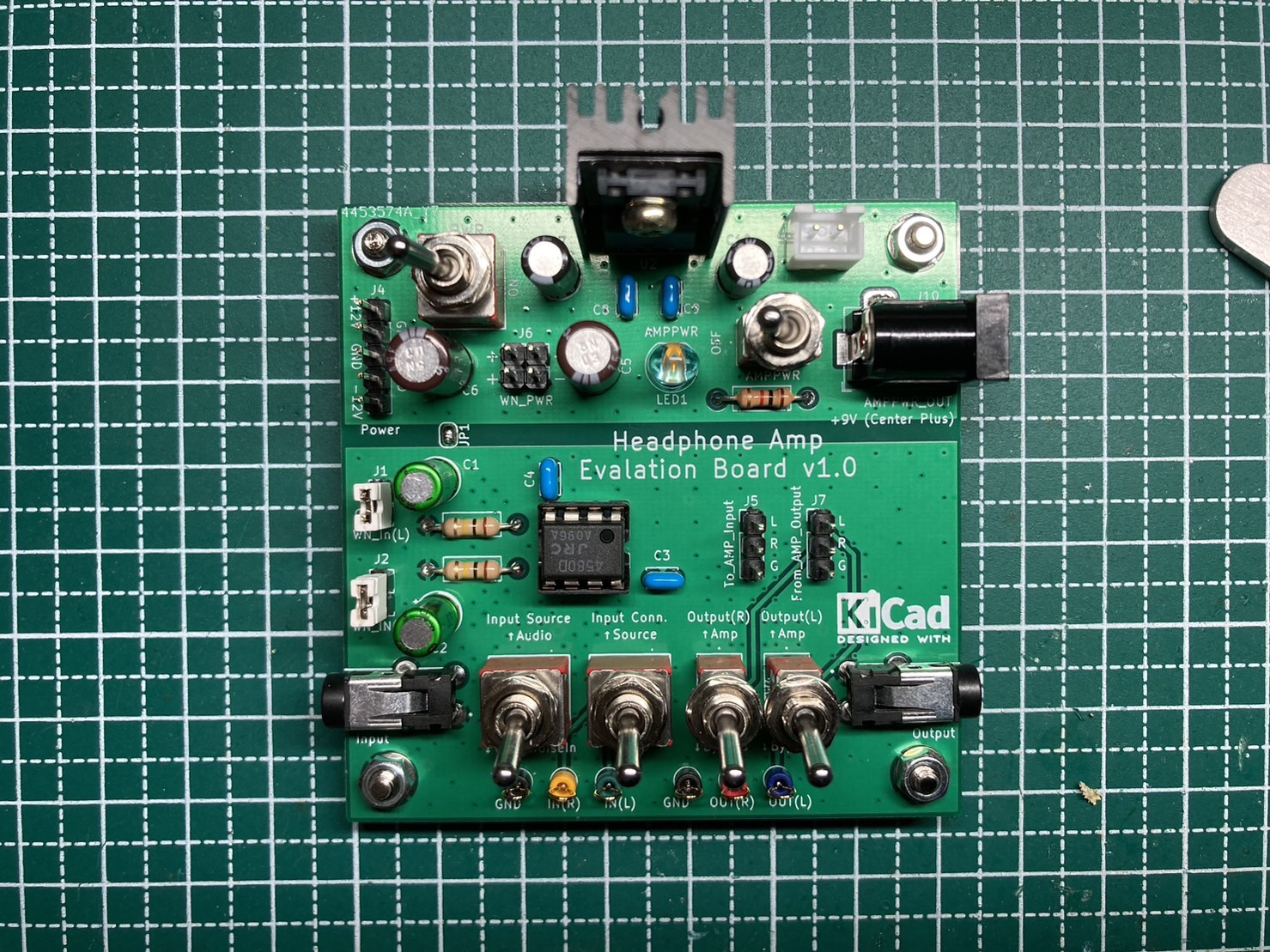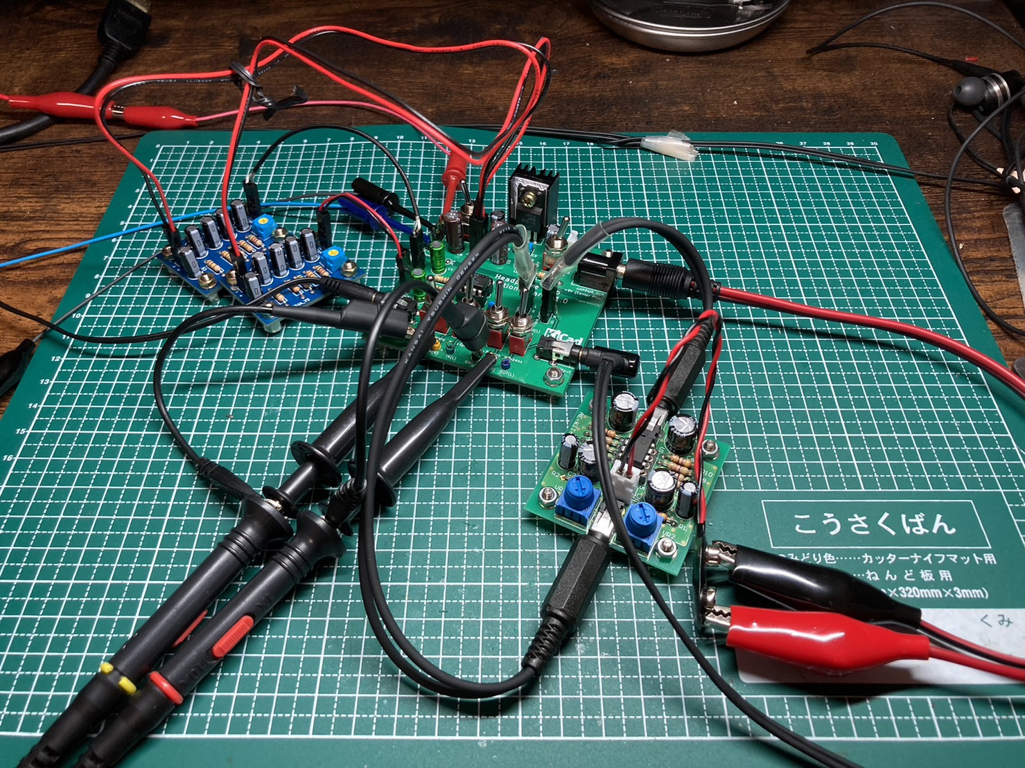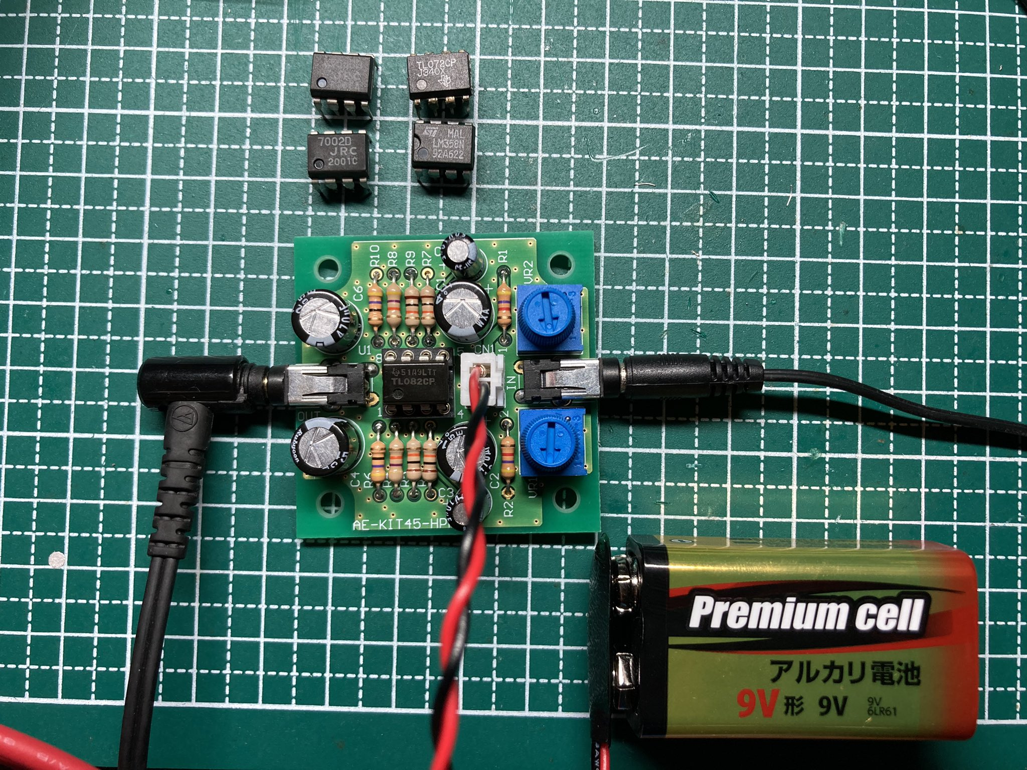 先述のヘッドホンアンプ製作用基板を、説明書通りに組み立てた以下の写真のような回路を用いる。