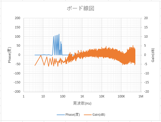 このようにして得られたデータは、「ボード線図」を用いることで視覚的にわかりやすく表すことができる。ボード線図とは図5のように、横軸に周波数をとり、縦軸方向に利得と位相差を一緒にプロットする図のことである。このように、利得と位相差を同じグラフ上に示すことで、周波数特性を一目で確認することができる。
