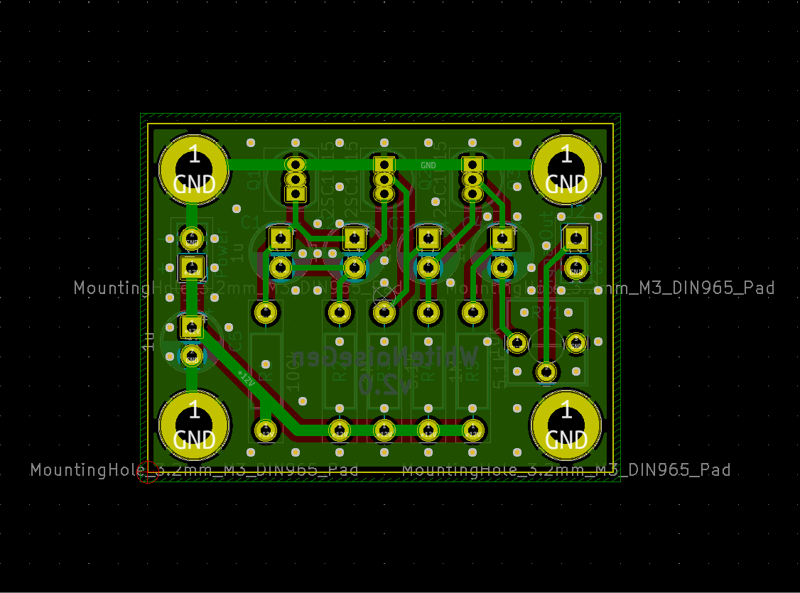 制作したホワイトノイズ発生器の回路図・レイアウト図・外観は以下の通りである。