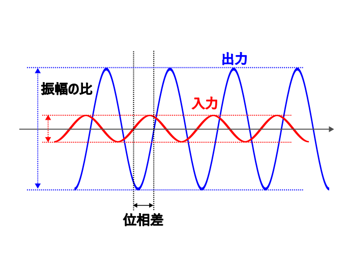これは、アンプの動作を考えたら直感的にも分かることで、大きい音量(振幅)を入れたら、出力として出てくる音の音量(振幅)も大きくなる、ということに他ならない。位相についても同じ話で、そもそも入力で位相がずれていれば、出力もその分ずれる、ということは想像に難くない。そこで、周波数特性に着目する際は、「入力を基準としたときの出力の振幅・位相の変化」に着目する。一見すると先ほどの話と同じように見えるが、「基準としてときの」というのが重要である。下図のように、「振幅」については、入力と出力の「比」を、「位相」については入力と出力の「差」を取ることにより比較するのである。