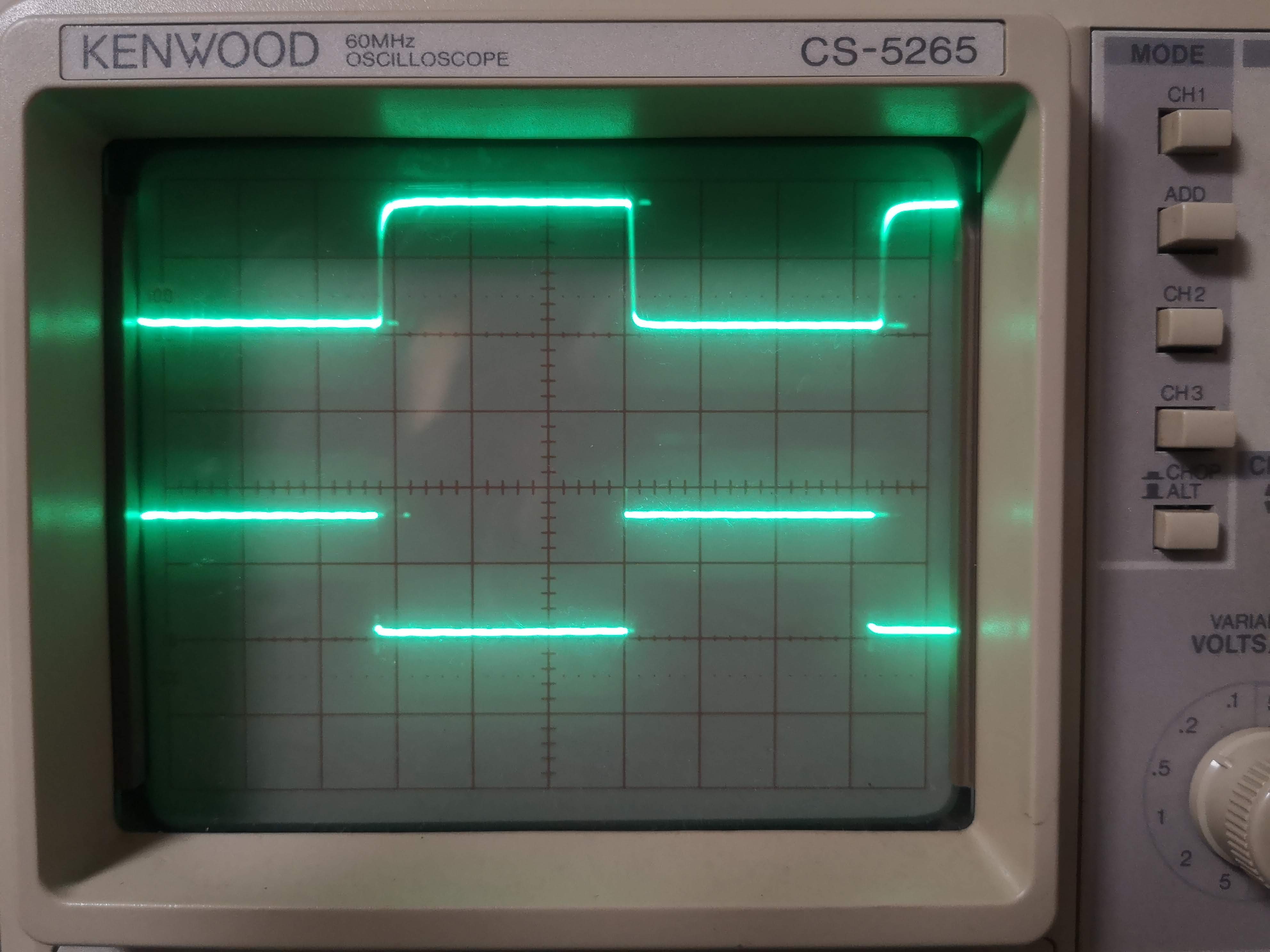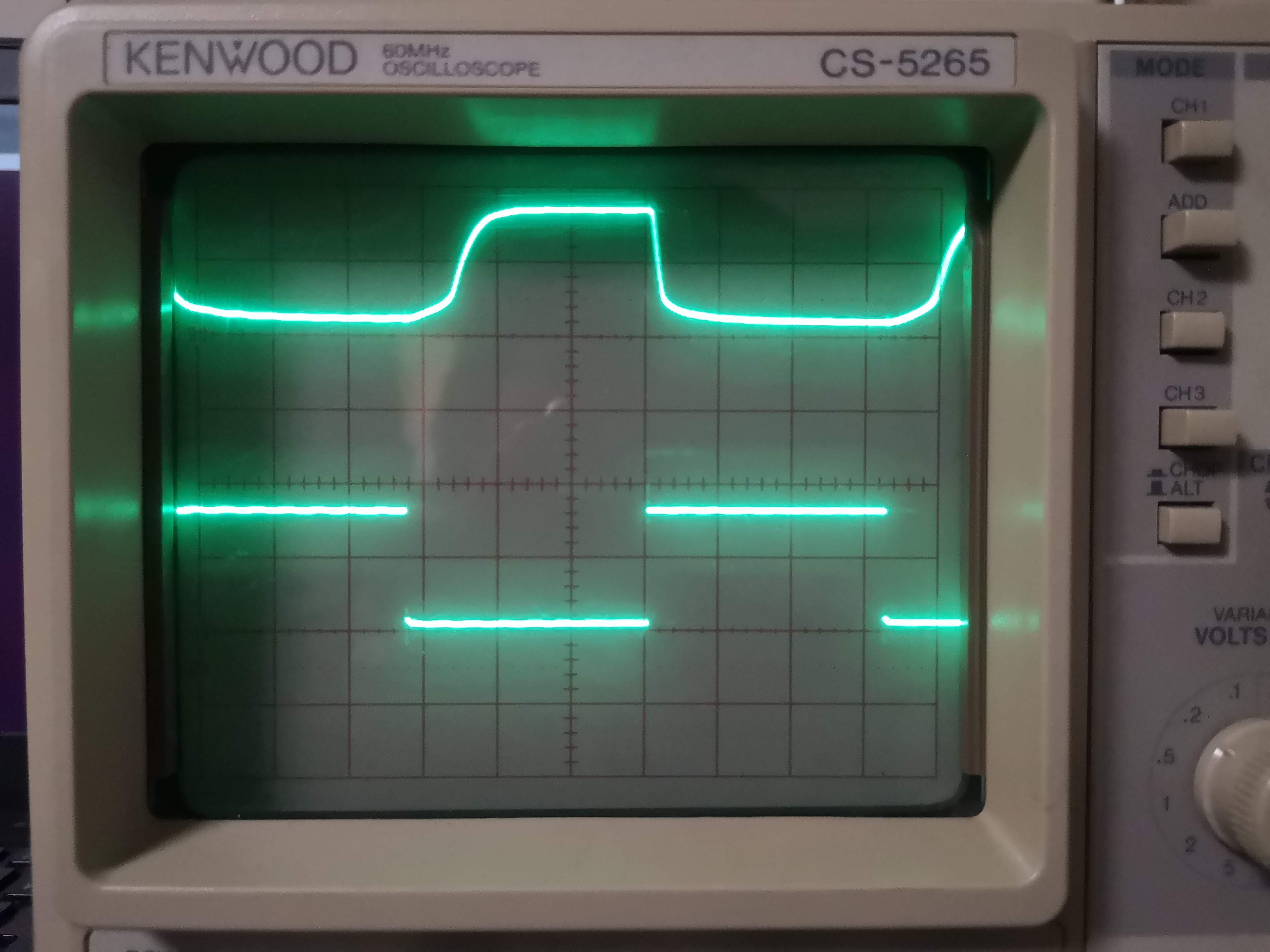 オシロスコープの表示を見ると明らかに信号が劣化していることが分かりますね。言わずとも伝わると思いますが、下側が入力信号、上側がフォトカプラの出力信号です。1目盛りは縦が2V、横が10μsですから、入力がH→Lになったとき、出力が完全にL→Hになるのに10μsほど掛かっていることが分かります。MIDIの仕様では立ち上がり・立ち下がりは2μs以内であることが求められているため、完全に失格です。立ち下がり(出力がH→Lになるとき)も同程度の遅延があればまだマシなのですが、立ち下がりはシュッとしていて、不均衡になってしまっています。