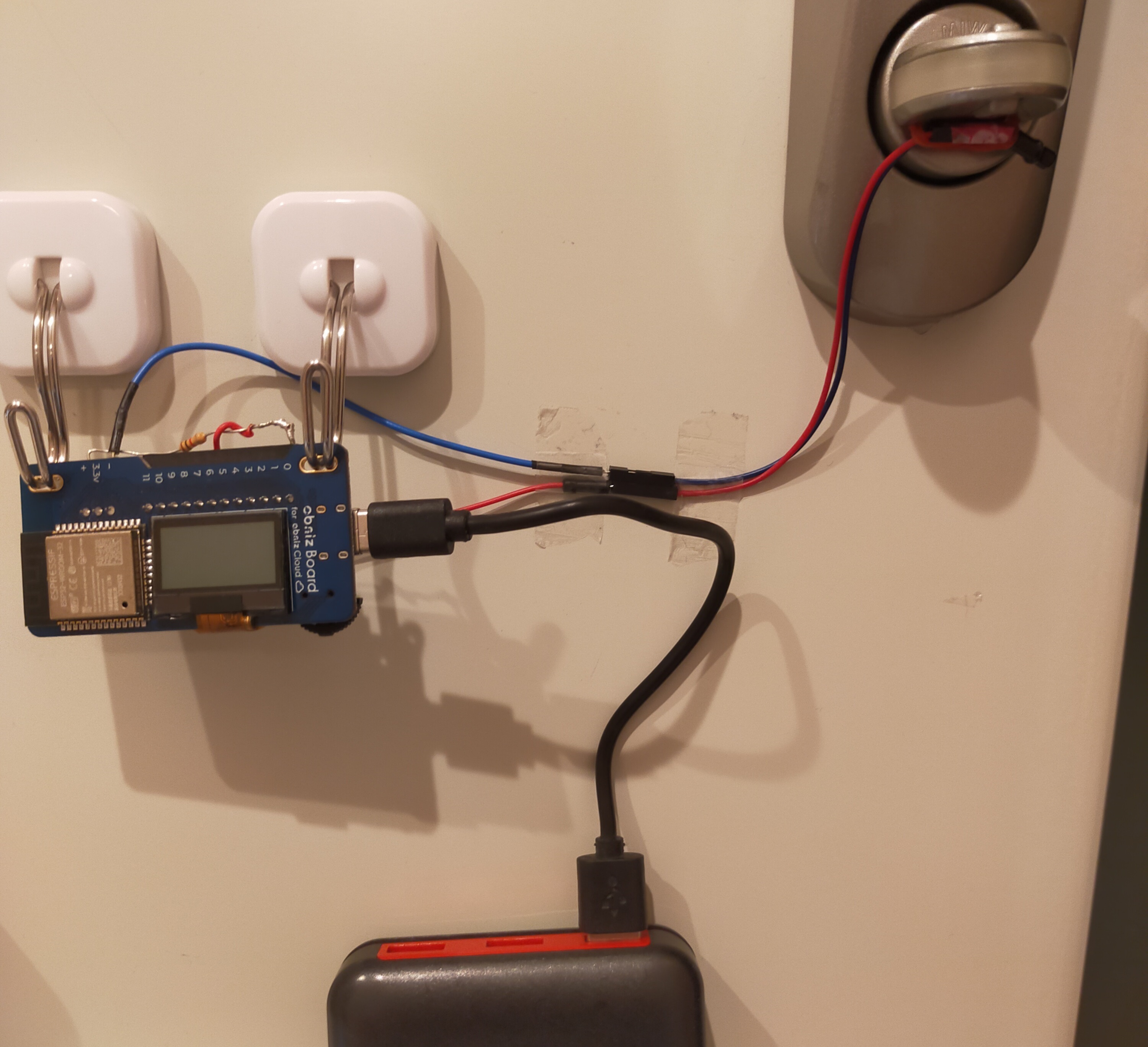 電源の供給方法はなんでもいいですが、ドアからコンセントまで配線すると邪魔なのでモバイルバッテリーも貼り付けて給電しています。