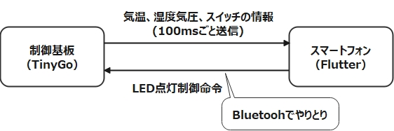 センサの制御はTinygo用のBME280のライブラリを使用しています。このライブラリは温度、気圧、湿度のデータを4バイトの整数データ値で返すので、Bluetoothで送信するために1バイトごとにデータを分割しています。100msごとにセンサの情報とスイッチの状態を送信しています。また、スマートフォン側からLEDの制御情報が送られるとそれを受信し、LEDの制御を行っています。