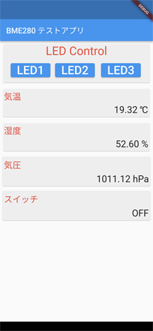 スマートフォン側では、Tinygo側から100msごとにセンサとスイッチの情報を取得し、表示しています。また、ボタンをタップするとLLEDの点灯制御用データを送信します。
