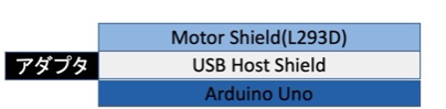 通信にはUSBホストシールドを使用しました。Bluetoothドングを差し込みps4のコントローラで操作できるようにしています。