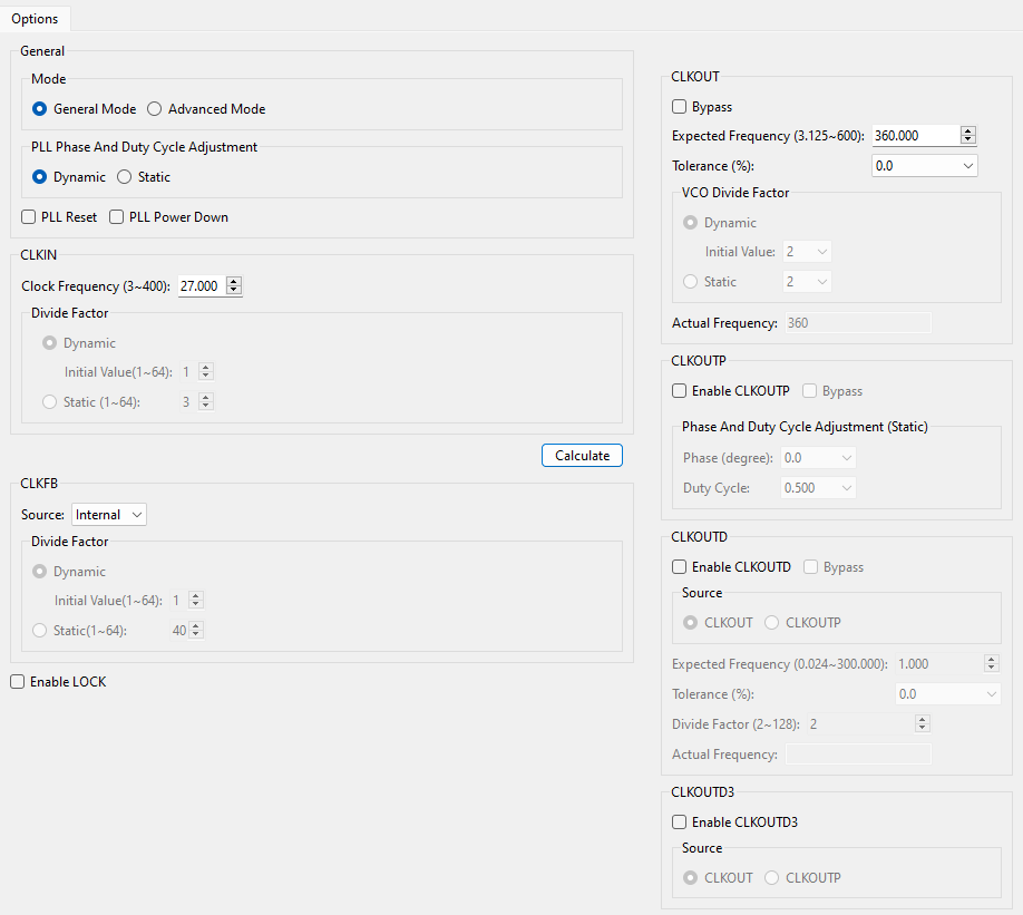 CLKINに27.000MHz、CLKOUTに360.0MHzを設定し、Calculateボタンを押すことで自動計算してくれます。