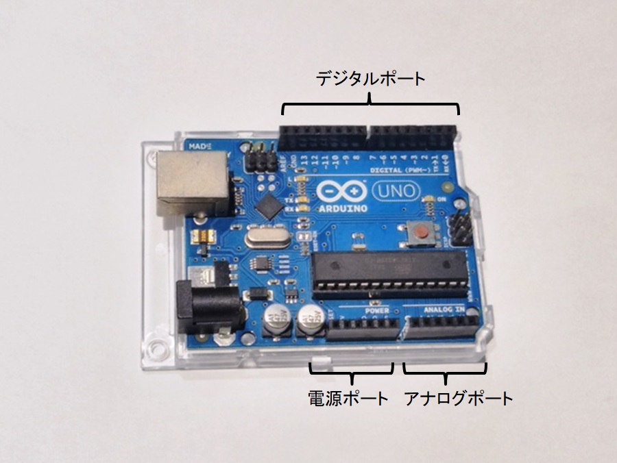 デジタルって何?アナログって何?と言う人は、プログラムでON/OFFを制御できるスイッチがデジタルポート、個数で測れない様な量の割合(マイコンボードは大体の場合で電圧になりますが)をプログラムで読み取るのがアナログポートだと考えておけばとりあえずはいいと思います。