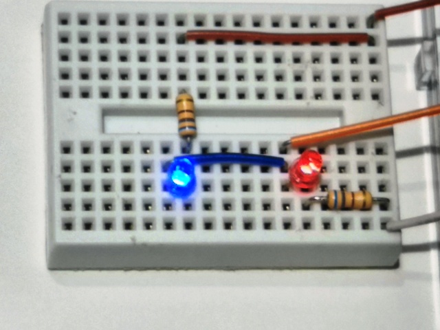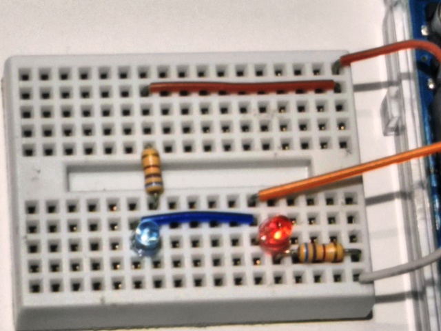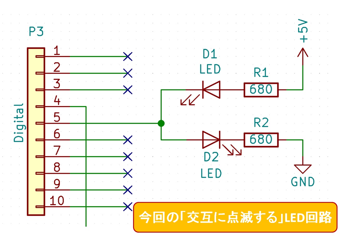 この状態で先ほどのプログラムを動かすと、二つのLEDは交互に点いたり消えたりを繰り返している様に見えます。