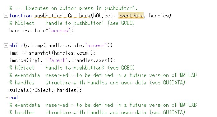 例えばOpening関数で設定したhandles.wcam1に代入された内容は,pushbutton1_Callbak関数へそのまま