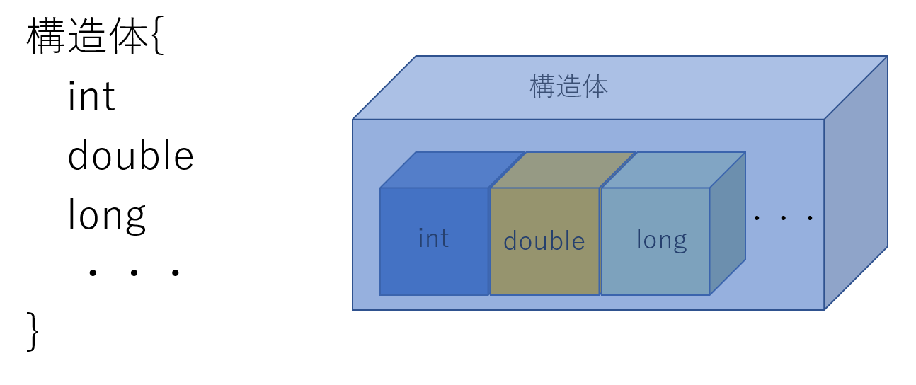 ちなみに構造体とは,左の図のようにintやdouble等多様な型式の変数を格納することができる変数の