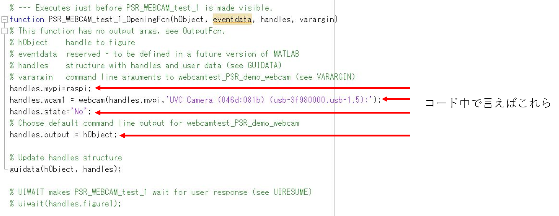 ・ラズベリーパイに接続されているウェブカメラの情報を取得するwebcamを使い,変数handles.wcam1に