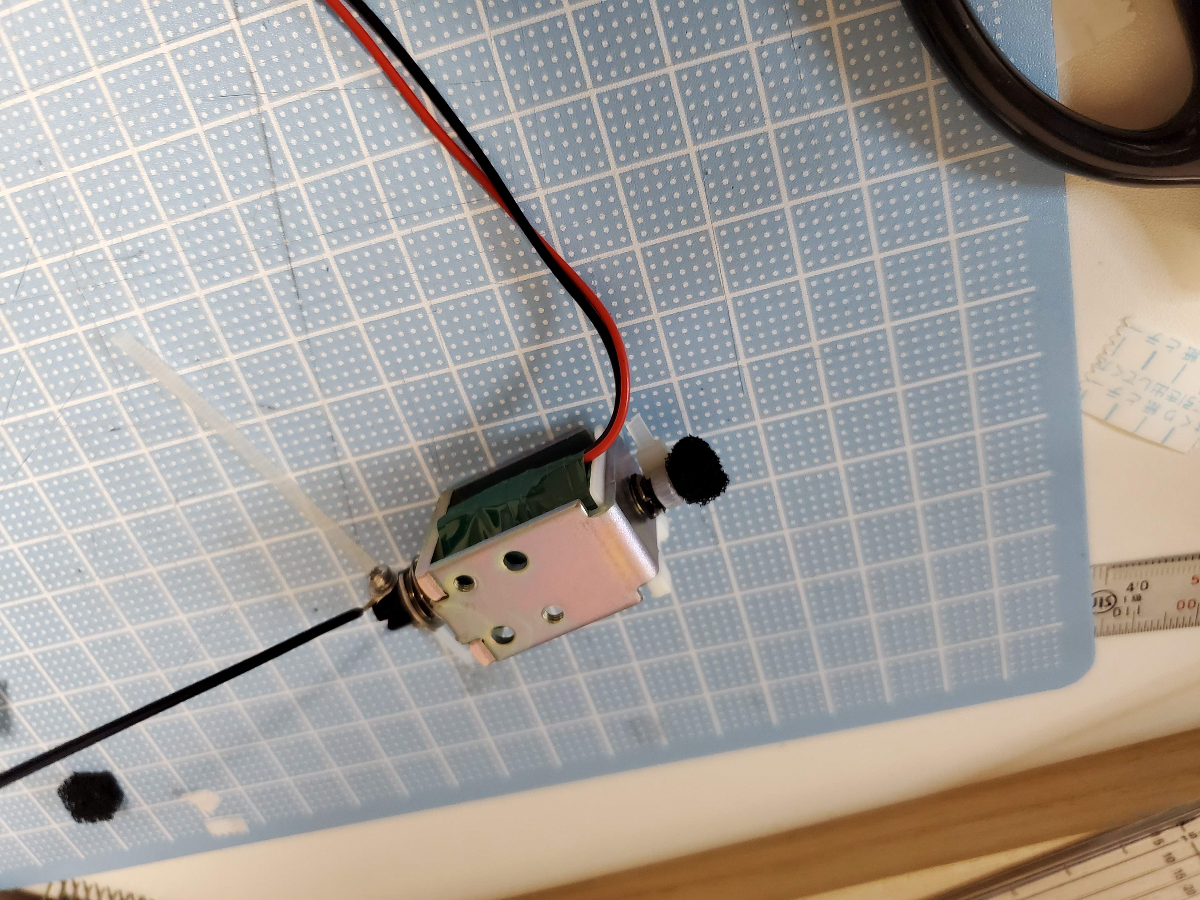 ※プランジャ(軸)から伸びている配線は、元々手まで導通させて、タッチペンで画面をタップする仕組みで動かそうと考えていた時のものです。