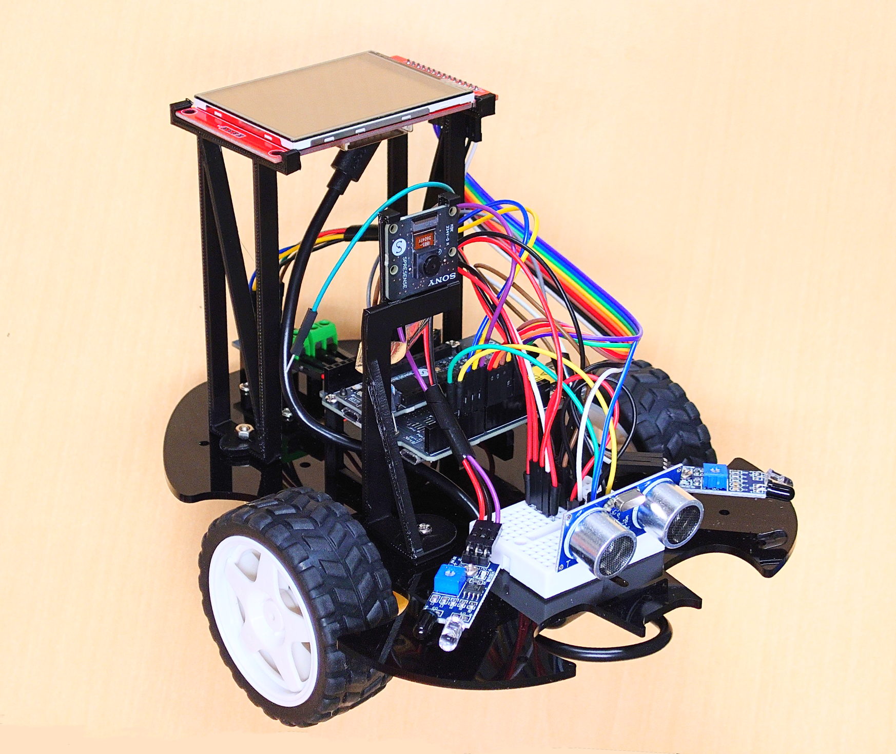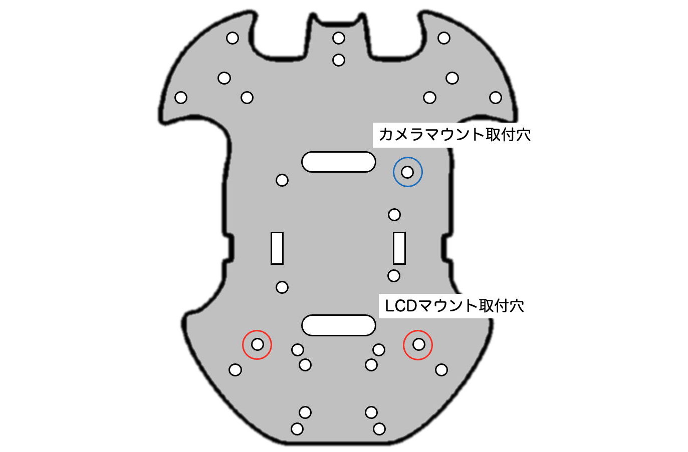 ロボットカー基板のトップビューです。カメラマウントとLCDマウントをM3×10mmボルトで取り付けます。