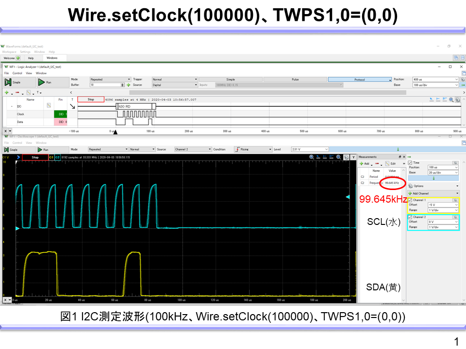 例えば、fSCLのデフォルト値(100kHz)の記述例と測定波形は以下となる。