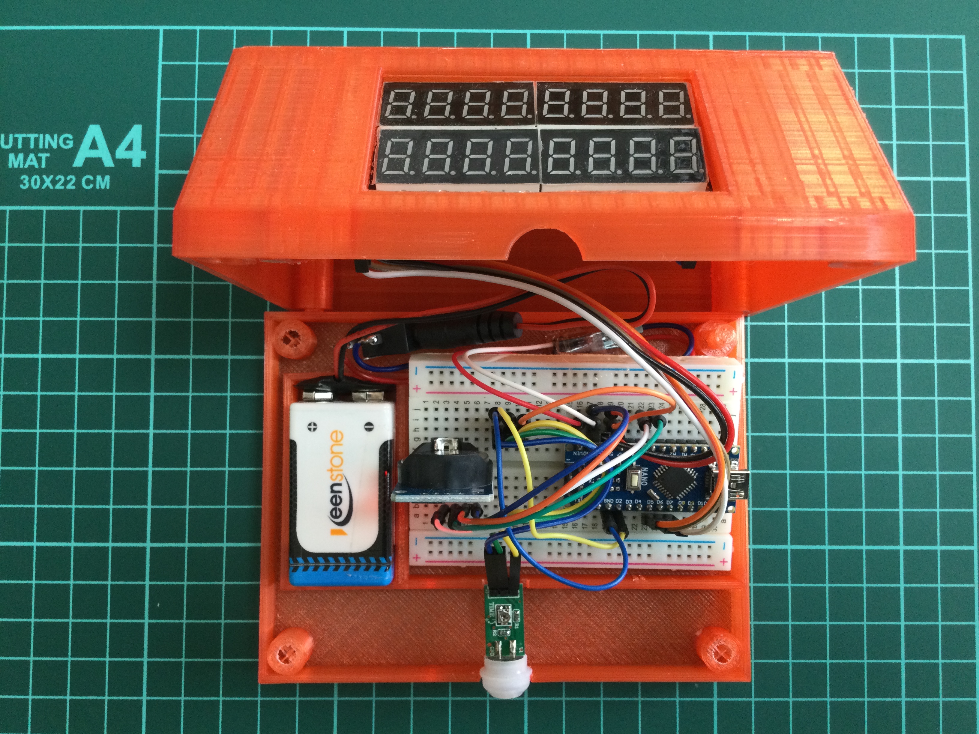 Arduino NanoにLEDモジュール、人感センサー、RTCモジュールを結線し、電源には9V電池を使用しました。