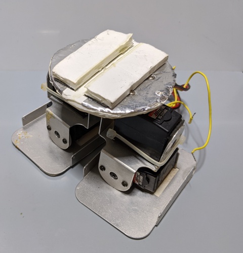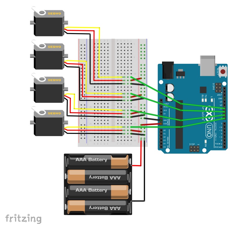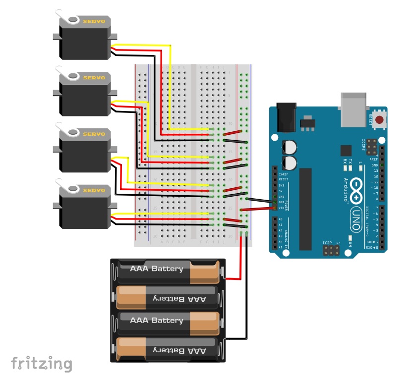 画像中の黒い四角い部分がサーボモーターで、全部で4個使用する構成になっています。