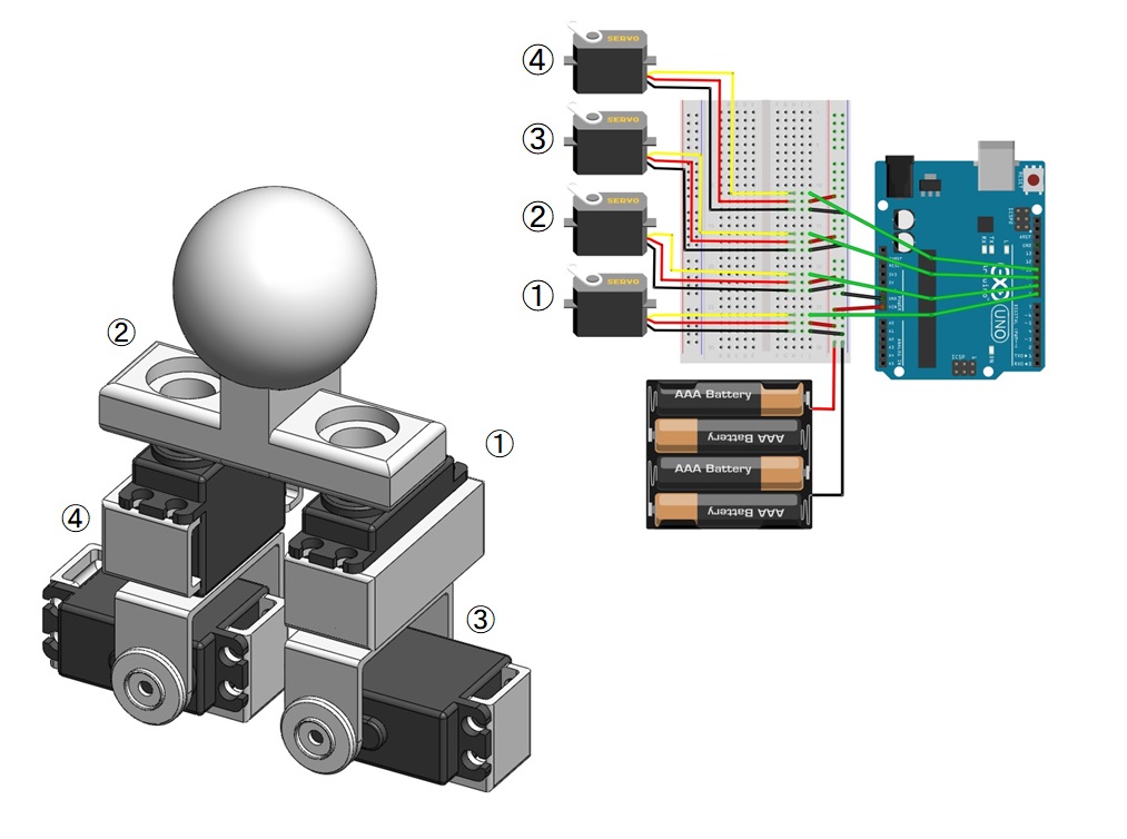 これからプログラムの説明に入りますが、各サーボモーターの取り付け位置は下図の①~④の位置にあるものとして進めて行きます。