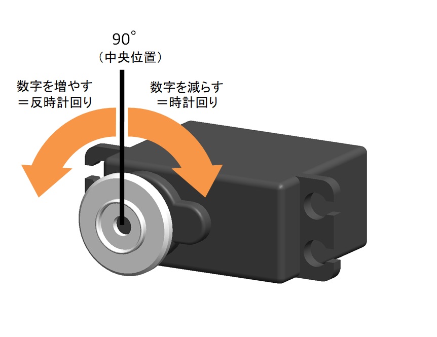 サーボモーターを中立の位置にする為に、通常は90度を基準の角度にしています。この値を中心に時計回り=値をマイナス、反時計回り=値をプラスする様な命令の仕方でも同様に制御する事ができます。