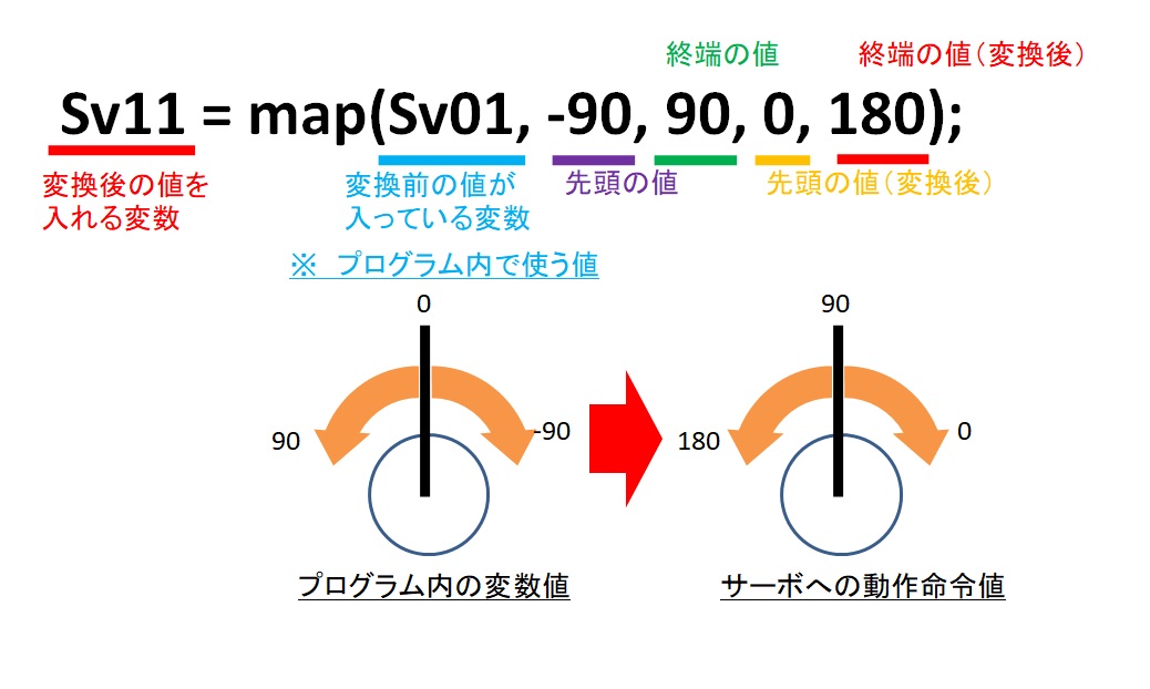 int Sv11 = map(Sv01, -90, 90, 180, 0); // ①は反転