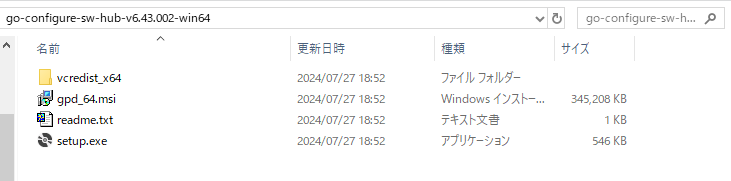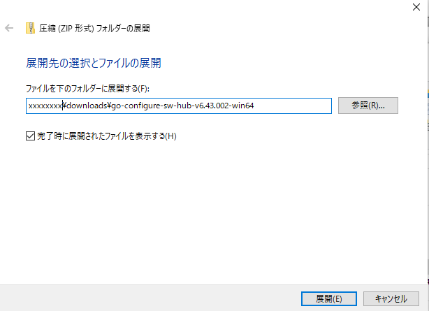 今回は、go-configure-sw-hub-v6.43.002-win64.zip がダウンロードフォルダにできました。このファイルを右クリックして「すべて展開(T)...」をクリックし、展開先のフォルダを指定して[展開(E)]をクリックすると、ファイルが展開されます。