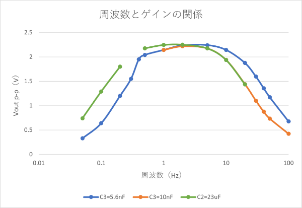 大体、最高点で U2A の出力電圧が 2.2Vp-p 程度になっています。電圧増幅率(ゲイン)は 2.2Vp-p/0.10Vp-p = 22 です。これは R3/R2 = 1Meg/47k ≒ 21.3 とほぼ等しく、計算通りの増幅率になっていることが分かります。そして、3 つの凡例いずれも 2Hz あたりを頂点として、それより低い、あるいは高い周波数の増幅率が落ちています。これは、この回路がバンドパスフィルタであることを示しています。