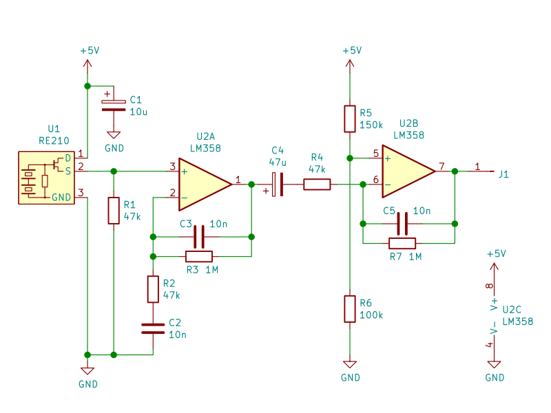 モジュールになっていない単体の焦電センサを用いた作例には、必ずと言って良いほどオペアンプを用いた増幅回路が登場します。elchika 内の記事 タイマーIC 555と焦電センサを用いたはんだごて切り忘れ装置の作製 でも、AKE-1/RE210 という焦電センサに増幅回路が接続されています。いろいろな作例を見ていると、部品定数は異なるものの、回路の構造としては大体が次のようになっています。