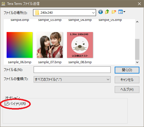 ※注:TeraTermで送信する際はバイナリのチェックをしないと正常に送信できません。