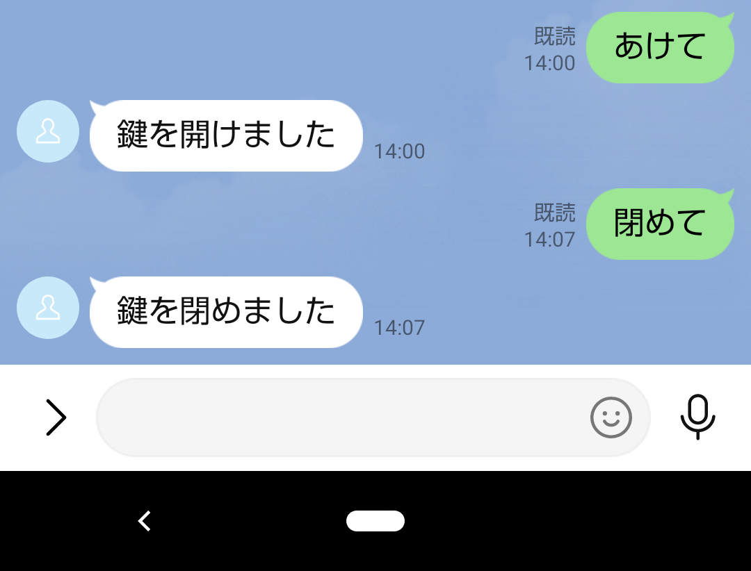 • 施錠したいとき…LINE Messaging APIで「施錠」や「鍵閉めて」などのキーワードを送信する