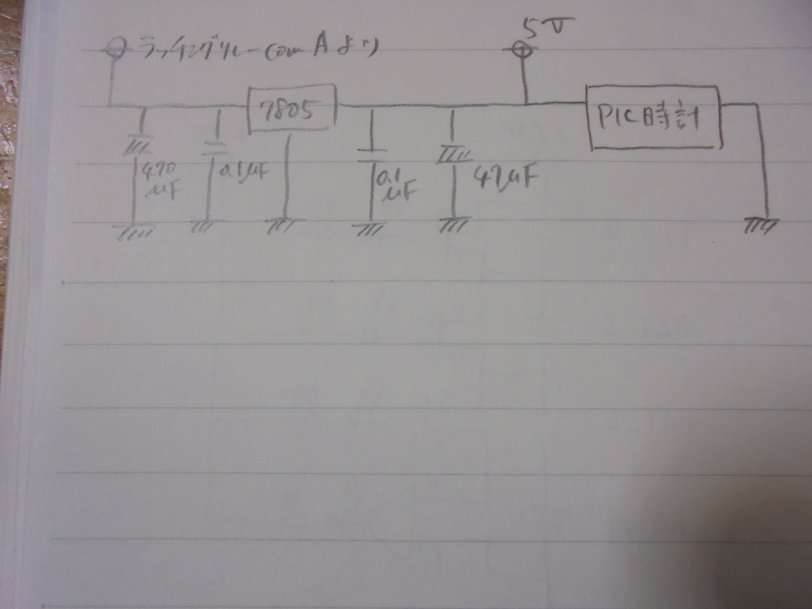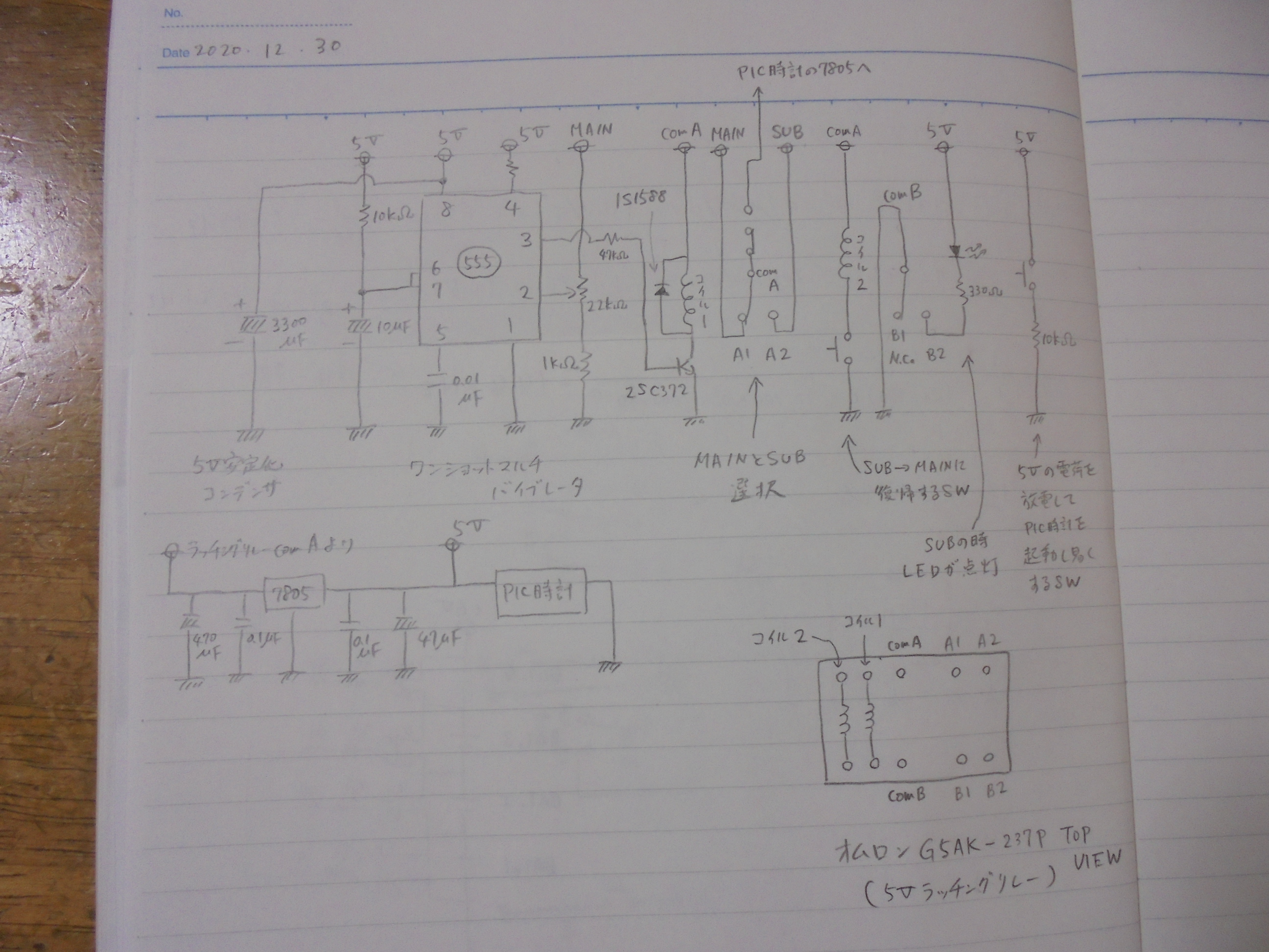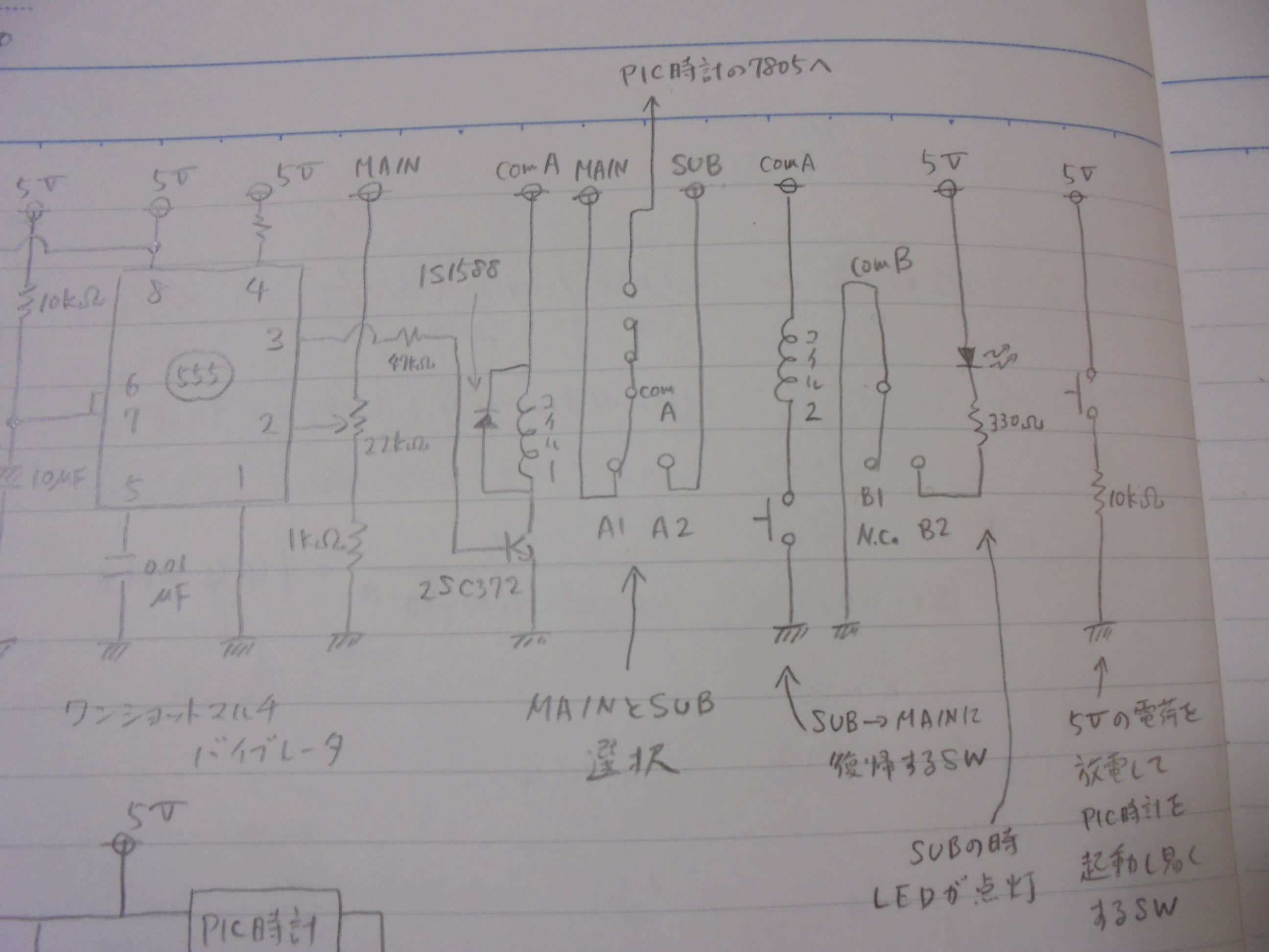 補助電源まで使い切ってしまい、PIC時計が止まると、5V系に繋いだ3300μFの電解コンデンサがなかなか放電せず、長時間待たないとPIC時計が再起動できません。その場合は、comAに繋がったスライドスイッチで、一旦電源からPIC時計を切り離し、回路図右端にある10kΩを介したタクトスイッチで電解コンデンサの電荷を放電することで、短時間でのPIC時計再起動を可能としました。