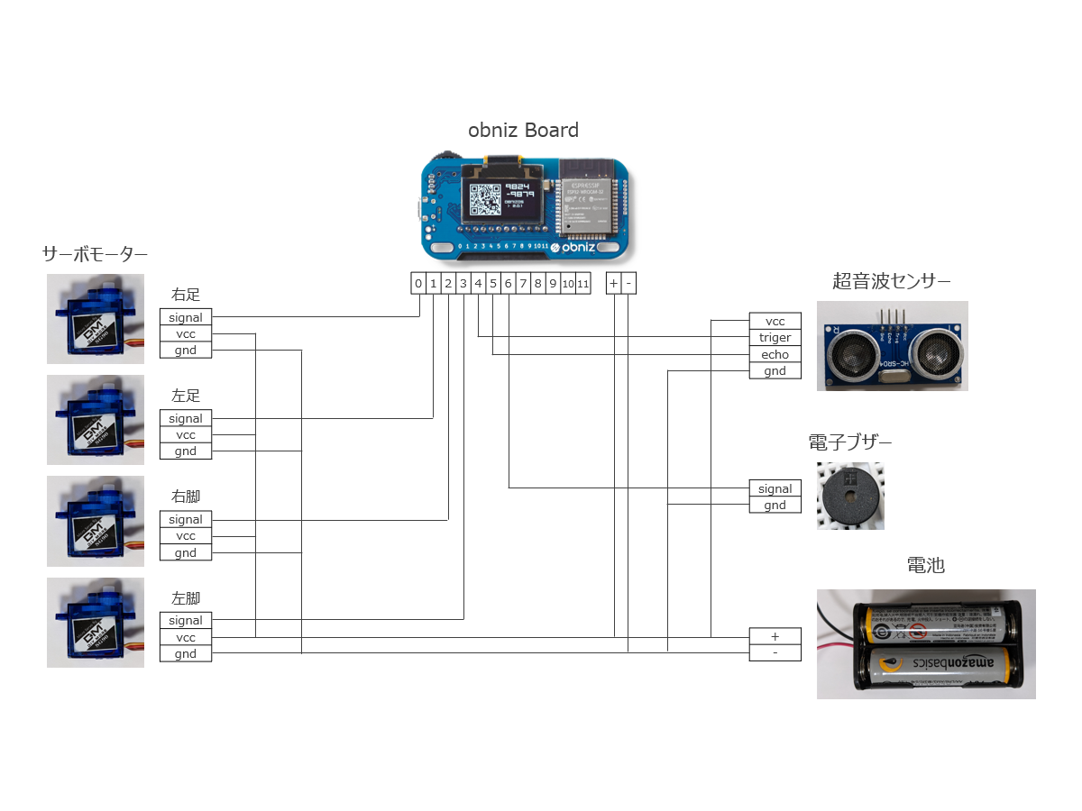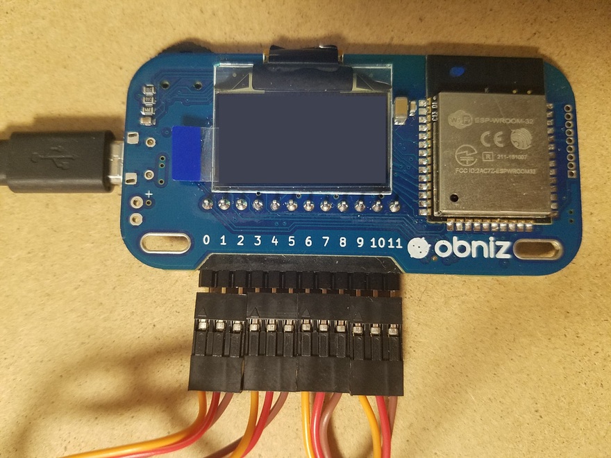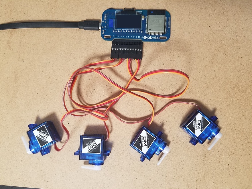 配線に工夫がいりますが、一例として私はピンヘッダを3枚くっつけ、片側をobnizに、もう片側にサーボモーターのピンを縦に挿して接続しています。