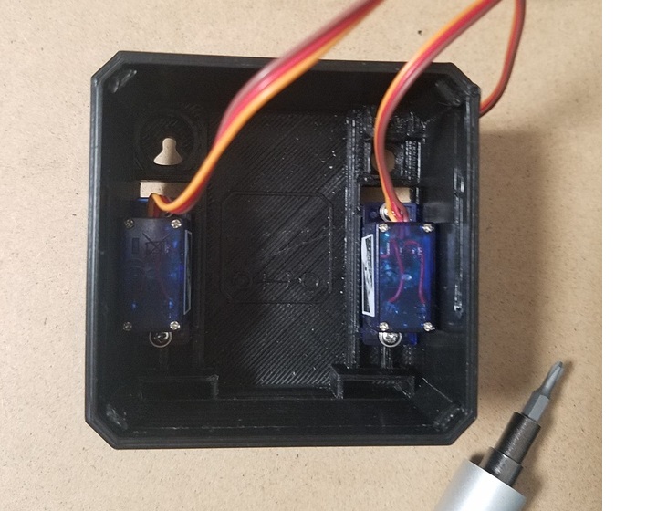 最後に胴体パーツに固定したサーボモータと脚パーツを組み合わせ、サーボモーター付属のネジで固定します。