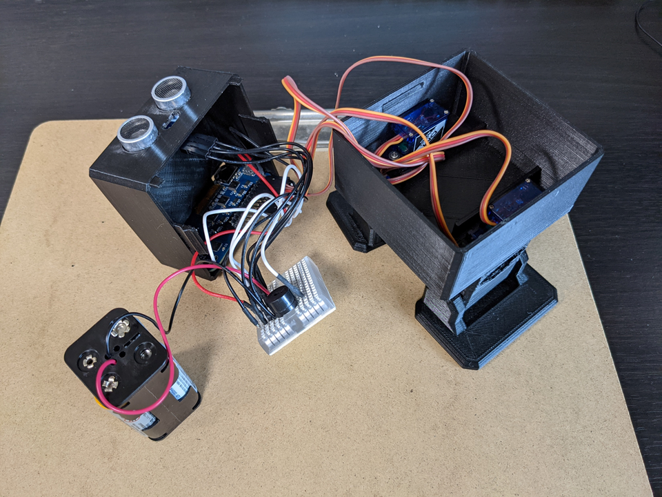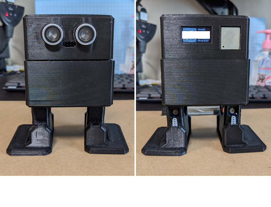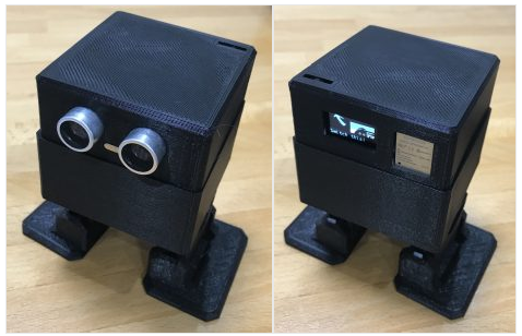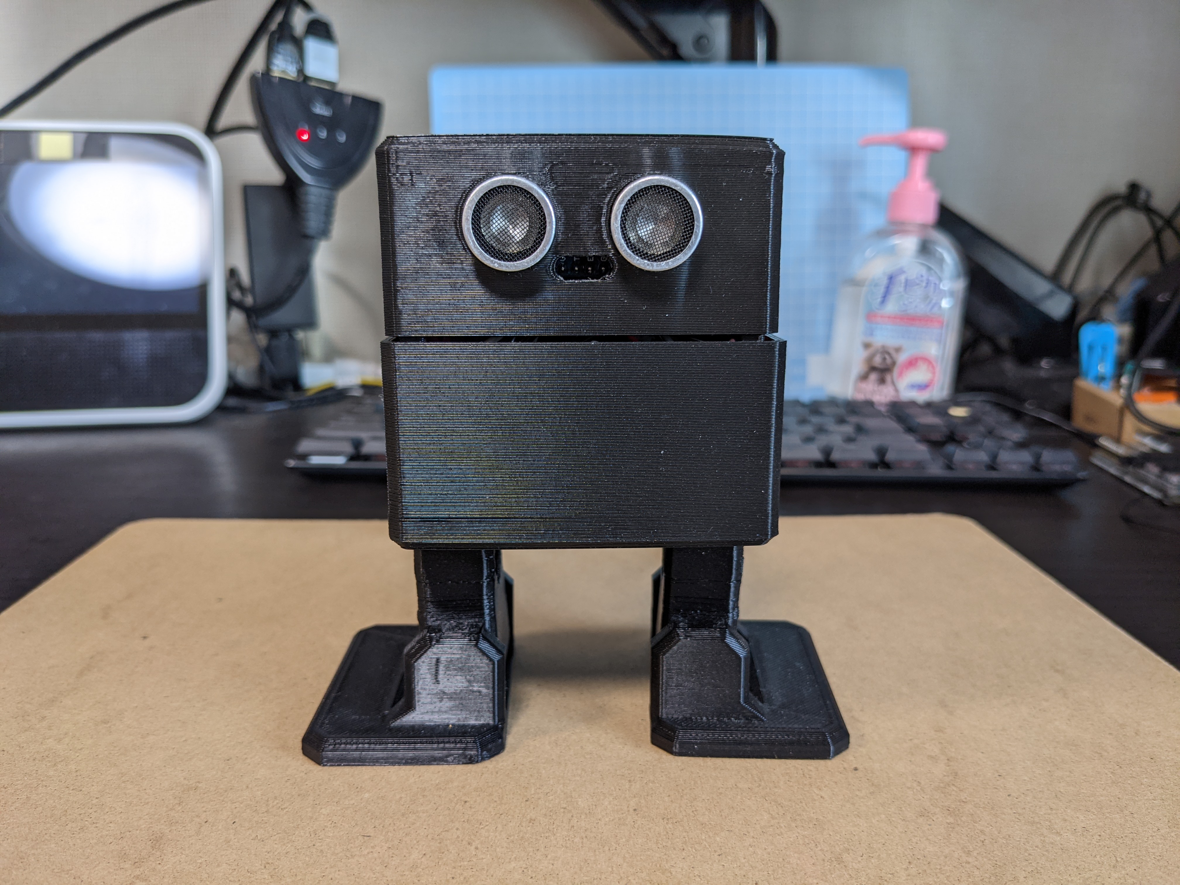 4つのサーボモーターで動かせる足と距離センサーにブザー、そして3Dプリントデータが公開されている筐体を組み立てて動かすロボットです。