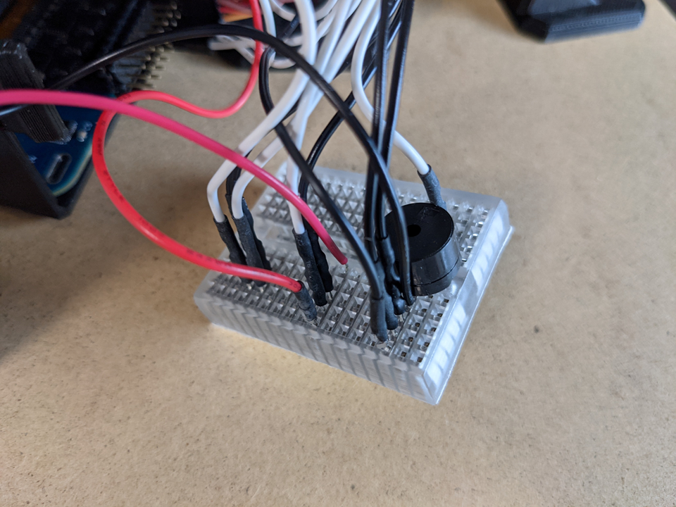 上記の3枚重ねピンヘッダを使用するとサーボモーターの配線がすっきりしますので、残りの超音波センサー、電子ブザー、電池ボックスは小さめのブレッドボードで簡単に配線しています。