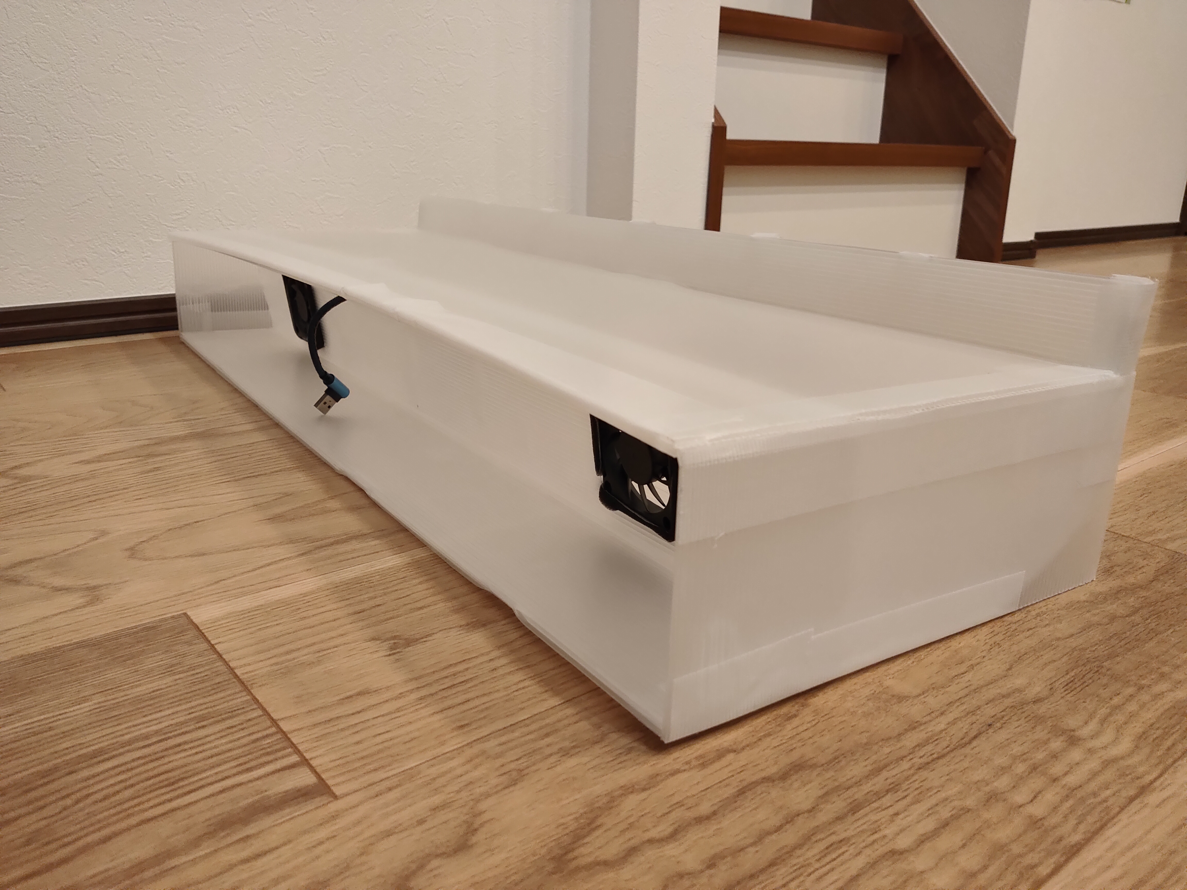 側面から吸気された空気を下向きに流れるようにスリット側の側面は局面にしました。