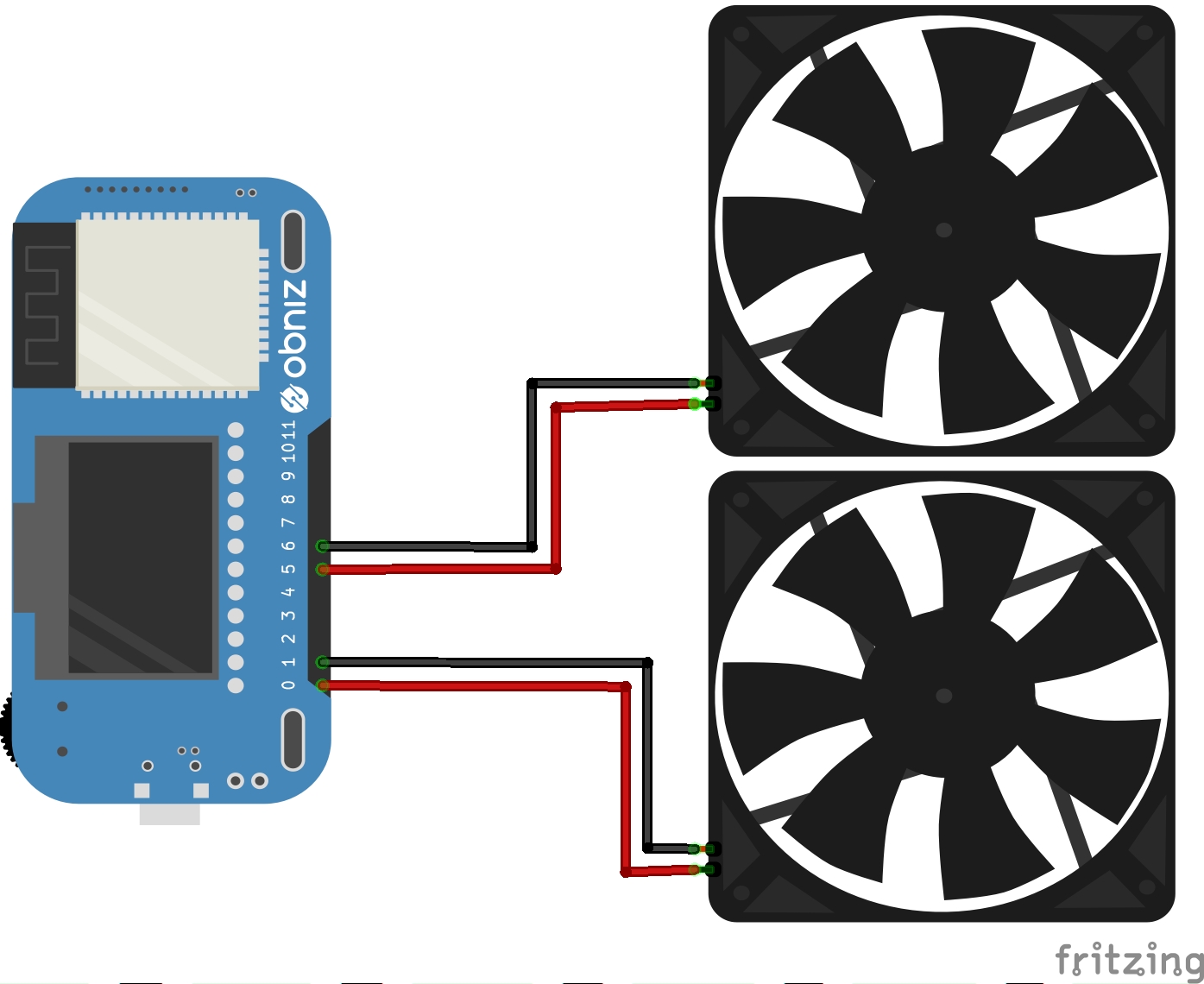 //ブロックプログラムのLEDを利用し、ファンを接続します