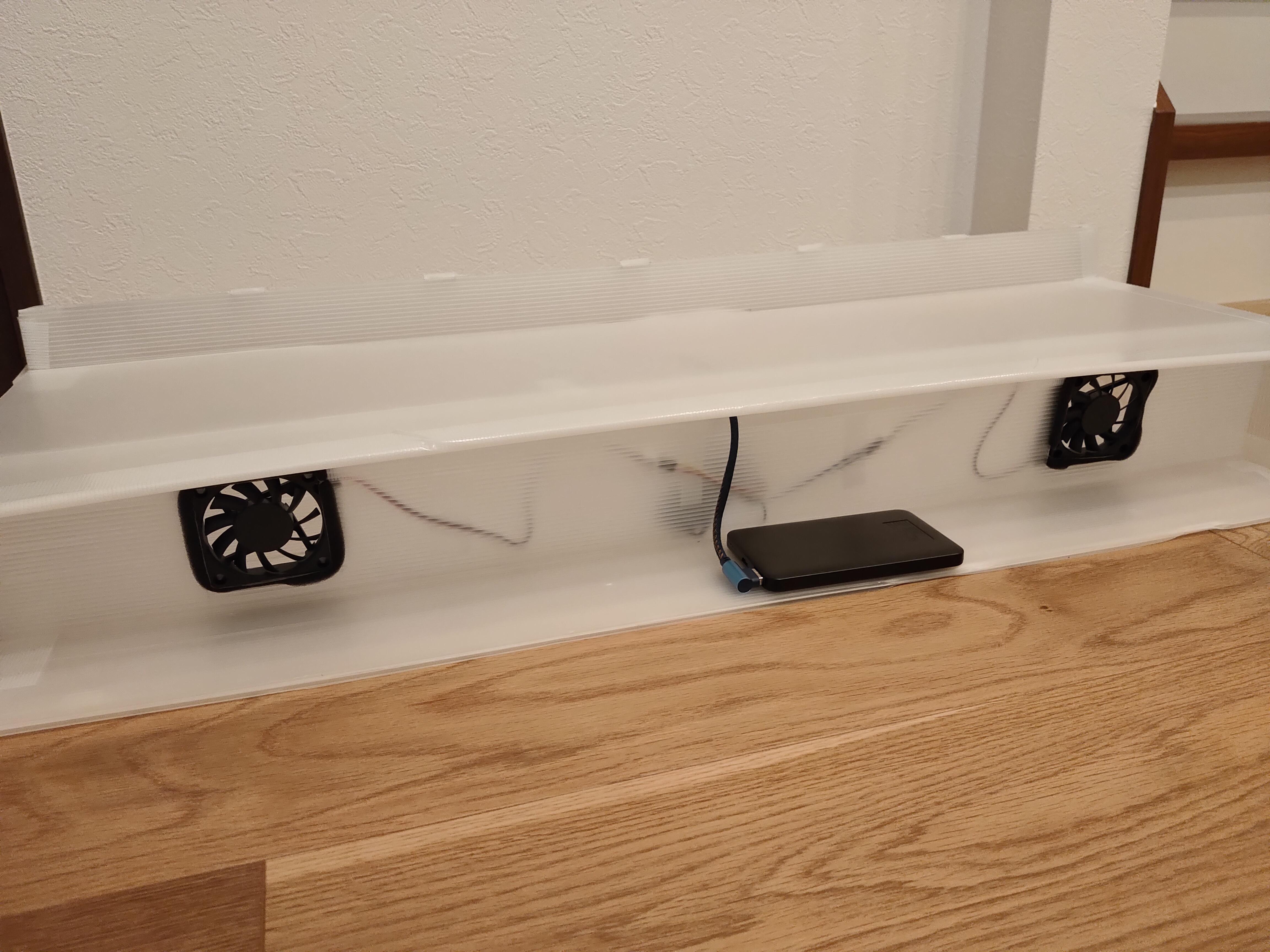 その反対側の側面に吸入孔をつくり、2つのファンから吸気します。