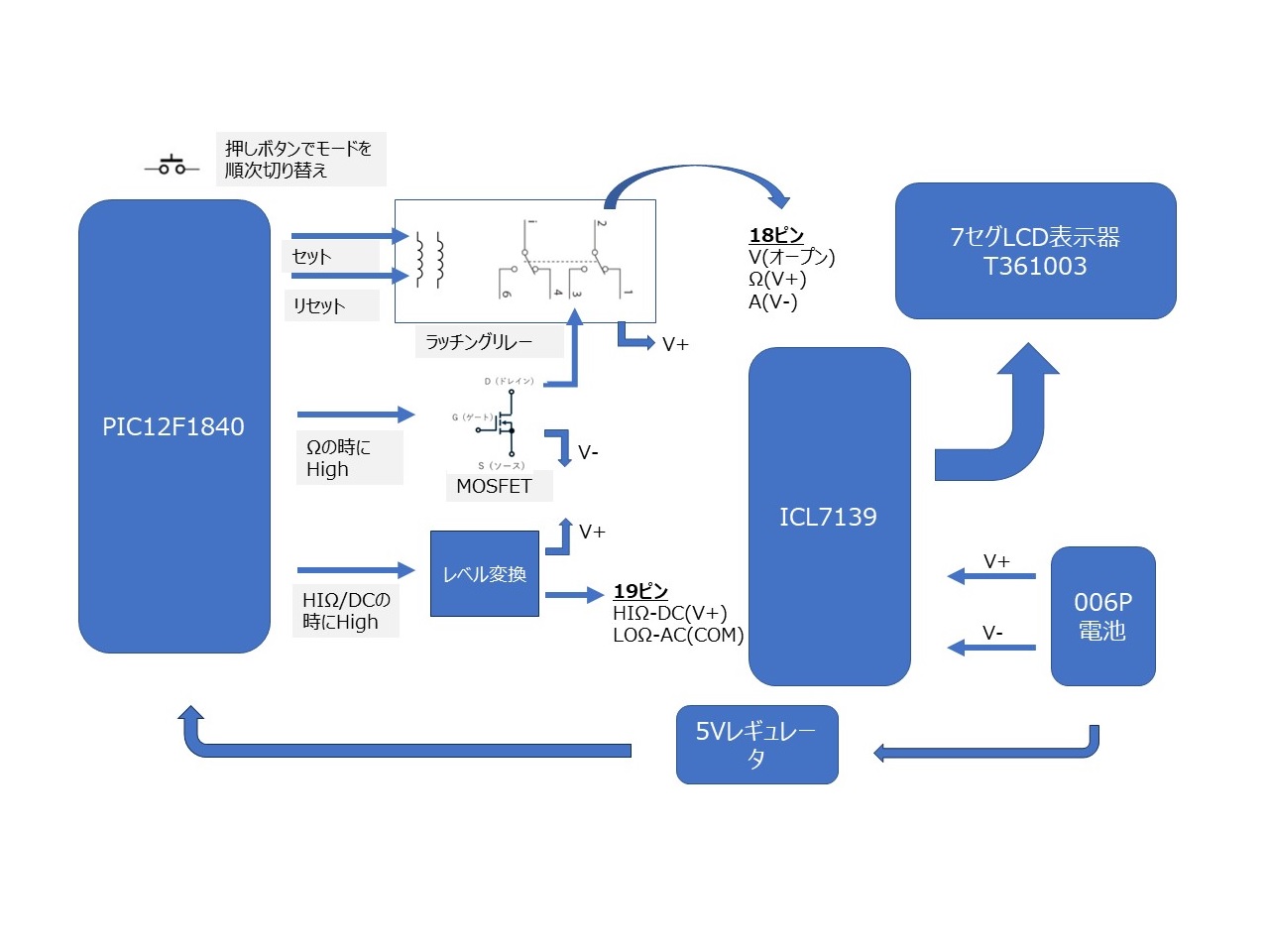 基本機能はICL7139 + LCDで賄えるのですが、モード切替の部分をボタン一つで切り替えできるようにPICを使ってコントロールする構成にしました。プッシュボタンを押すことで、