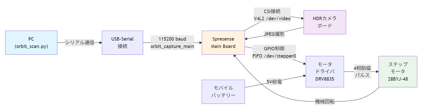 本システムはハードウェア制御層(Spresense側)とホスト制御層(PC側)に分けられている。