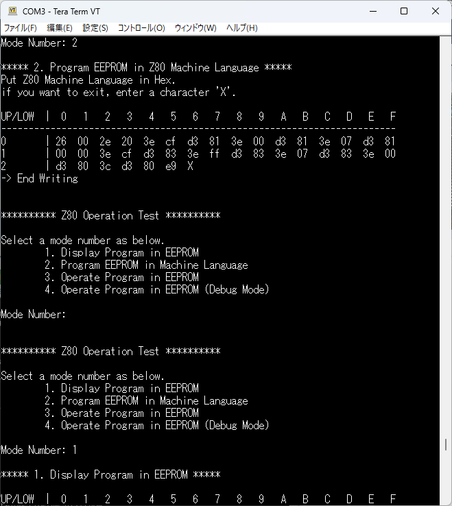 メモリエミュレータの機能を実装するだけであれば、Z80のプログラムは、PICのソースコード上に書けば十分である。しかし、この方法では、プログラムを変更するたびにPICのファームウェアを書き換える必要があり、そのたびにMPLABやプログラマを起動させなければならず、非常に手間である。そこで、PICのUARTを用いて、Tera Term上で動作するバイナリエディタを作成し、このエディタ上でプログラムを書き込めるようにした。