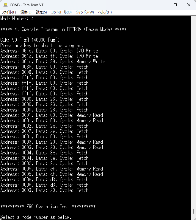 プログラム動作中に、アクセス中のメモリアドレスとデータバスの内容、そして、実行中のサイクルをTeraTerm上にモニターする機能である。Z80から送られるアドレスバス、データバス、制御信号を読み取り、それらをシリアル通信でモニターすることで実現している。