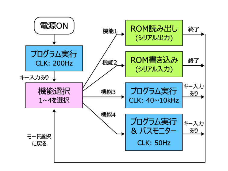 これら機能の状態遷移図は下図のようになっている。電源投入直後は、1の仮想ROMに記録されたプログラムを実行する。この時、何らかのキーボード入力が入るとプログラム実行を停止し、実行させる機能選択の画面に遷移する。ユーザーにより実行する機能が選択されると、その機能が実行され、各機能で決められた遷移条件を満たすと、再び機能選択画面に戻る。以上が全体の動作の流れとなる。次節からは、これら機能の概要を説明していきたい。