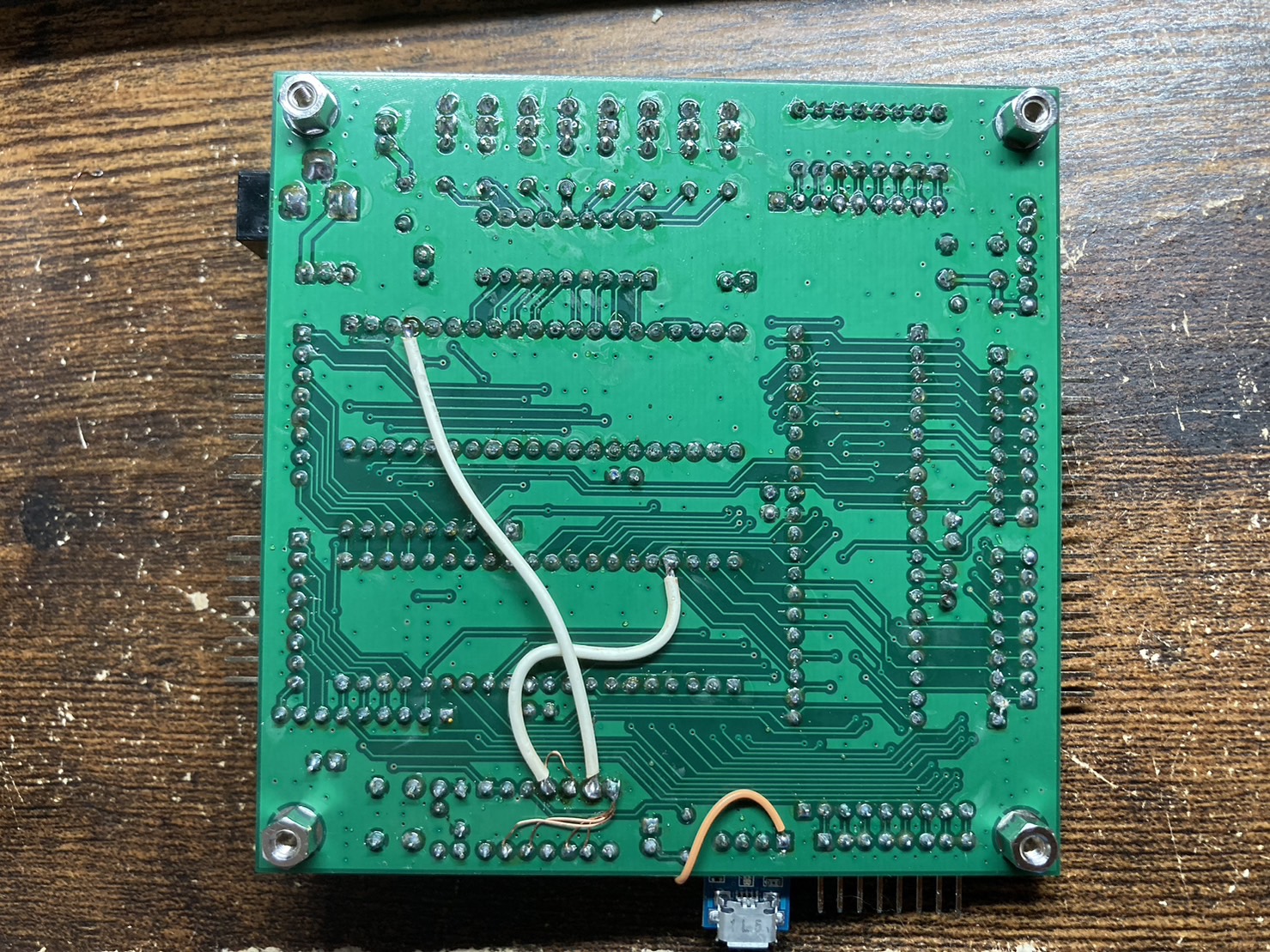 また、作成したPCBに部品実装や配線を施し、実際に完成したハードウェアは以下のようになる。裏面の画像を見ればわかる通り、白いワイヤで配線の修正を行っており、設計思想で触れたリカバリー用のロジックを早速活用した。