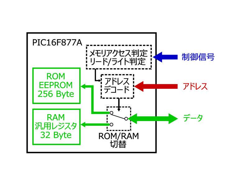 - ROMの読み出しの場合はEEPROMからデータを読み出し、RAMの読み書きの場合は汎用レジスタに確保したRAM用領域にアクセスしてデータを送受する。