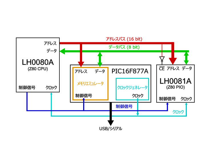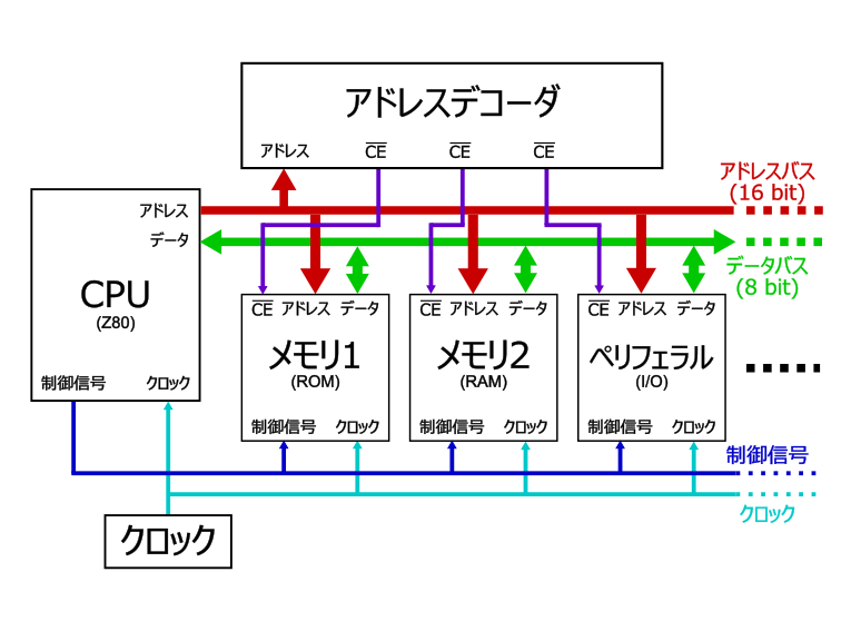 CPUにZ80を用いてコンピュータを製作する場合、そのアーキテクチャは一般的に下図のようになる。