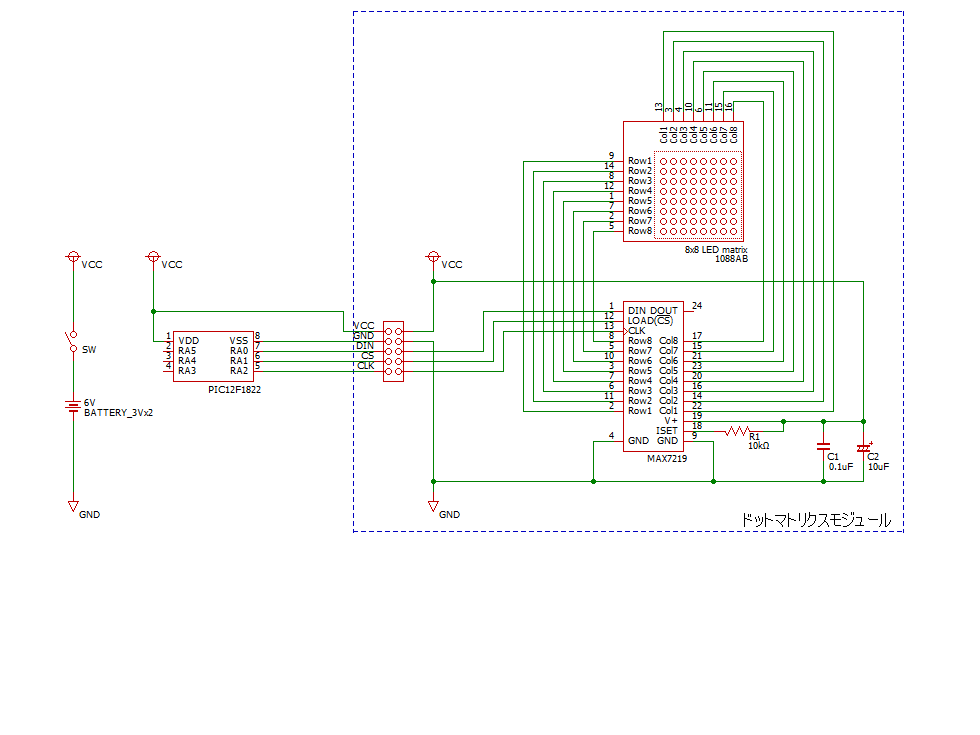 マイコン(PIC12F1822)でLEDドライバ(MAX7219)を制御し、8x8 LED matrixにアニメーションを表示させます。