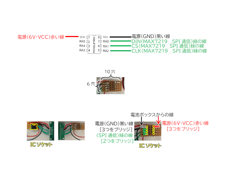 切ったユニバーサル基板にPICマイコン用の8ピンソケットと電線をはんだ付けします。
