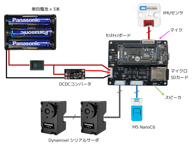 - M5 NanoC6 および IMUセンサ との接続にはGroveケーブルを使用しますが、センスチャン基板側はスペースの都合でGroveコネクタではなく、JST EH 4ピンです。