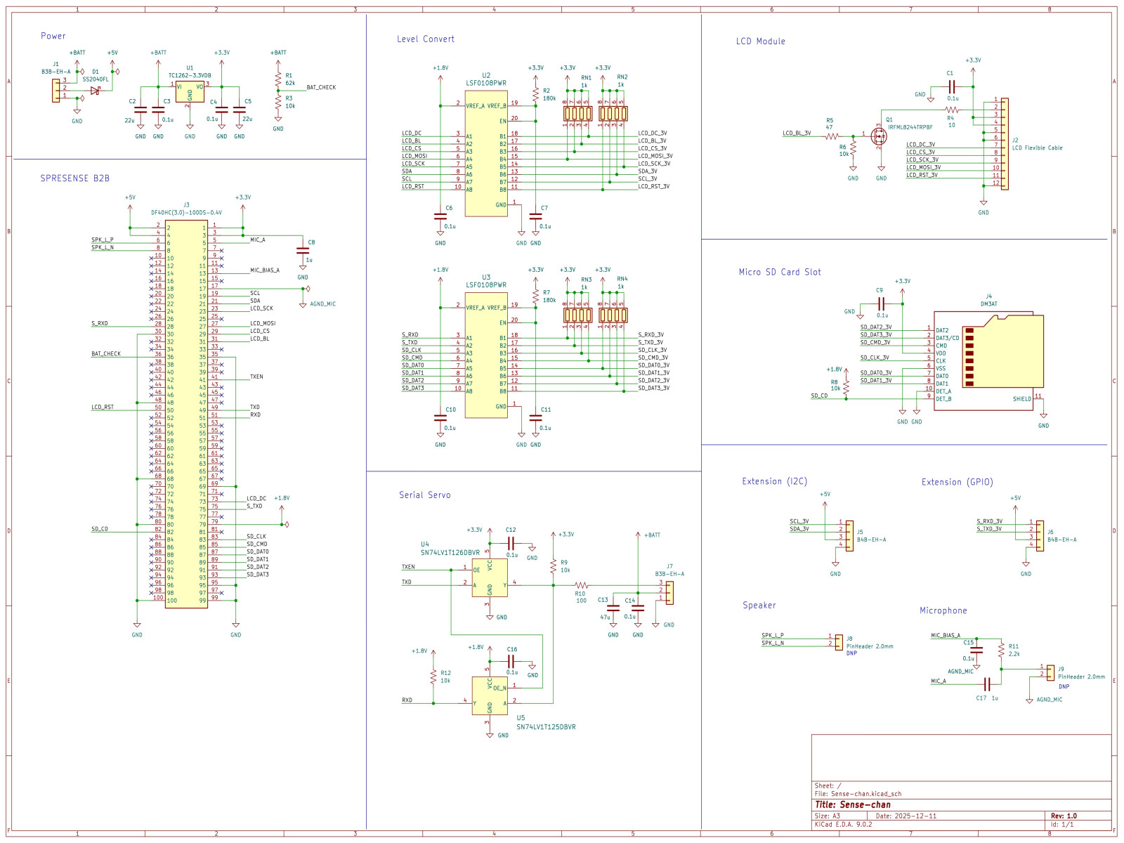 センスチャン専用基板を設計しました。SPRESENSEメインボードを拡張し、M5Stackと同等の2インチ QVGA(320x240) の液晶パネルを実装できます。また、シリアルポートの半二重化回路も搭載し、シリアルサーボを直接接続できます。