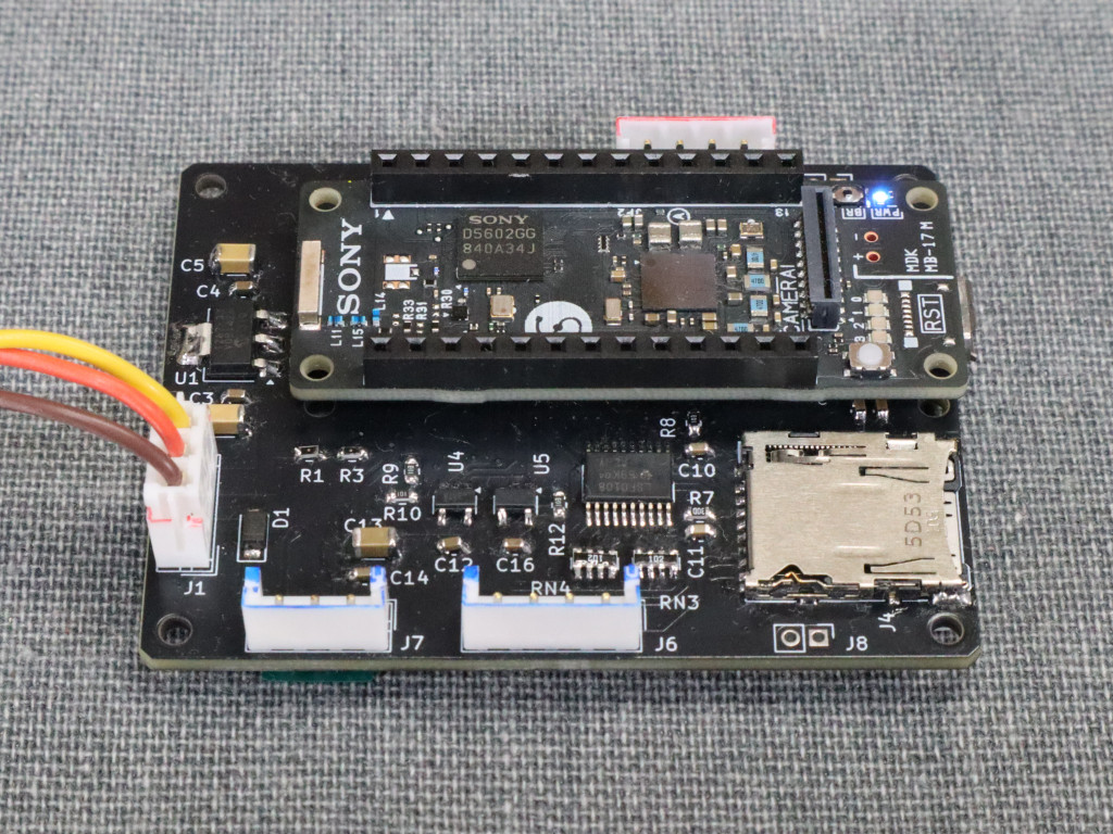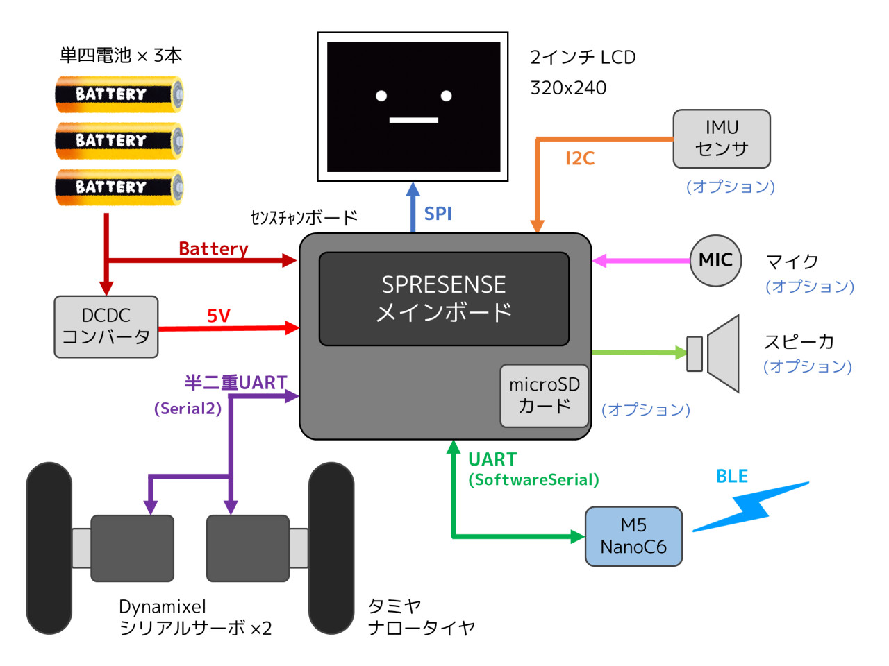 無線通信 (BLEまたはWiFi) のためにM5Stack NanoC6を接続でき、SPRESENSEメインボードとはUARTで通信します。また、IMUセンサ等のモジュールも接続でき、SPRESENSEメインボードとはI2Cで通信します。これらの接続にはGroveケーブルを用います。