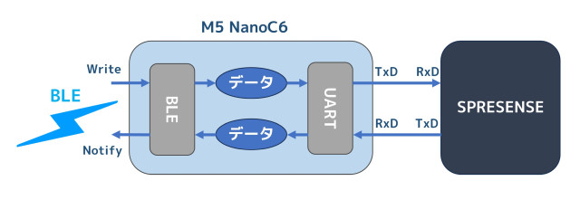 SPRESENSEとM5NanoC6をUARTで接続し、M5NanoC6には送受信データへBLEサービスにブリッジさせます。BLEサービスは NUS (Nordic UART Service) を使用します。ただし、SPRESENSEの2つのシリアルポートのうち、SerialはUSBシリアル通信専用であり、Serial2はシリアルサーボとの通信に使用するので、M5NanoC6との通信にはSoftwareSerialを用います。